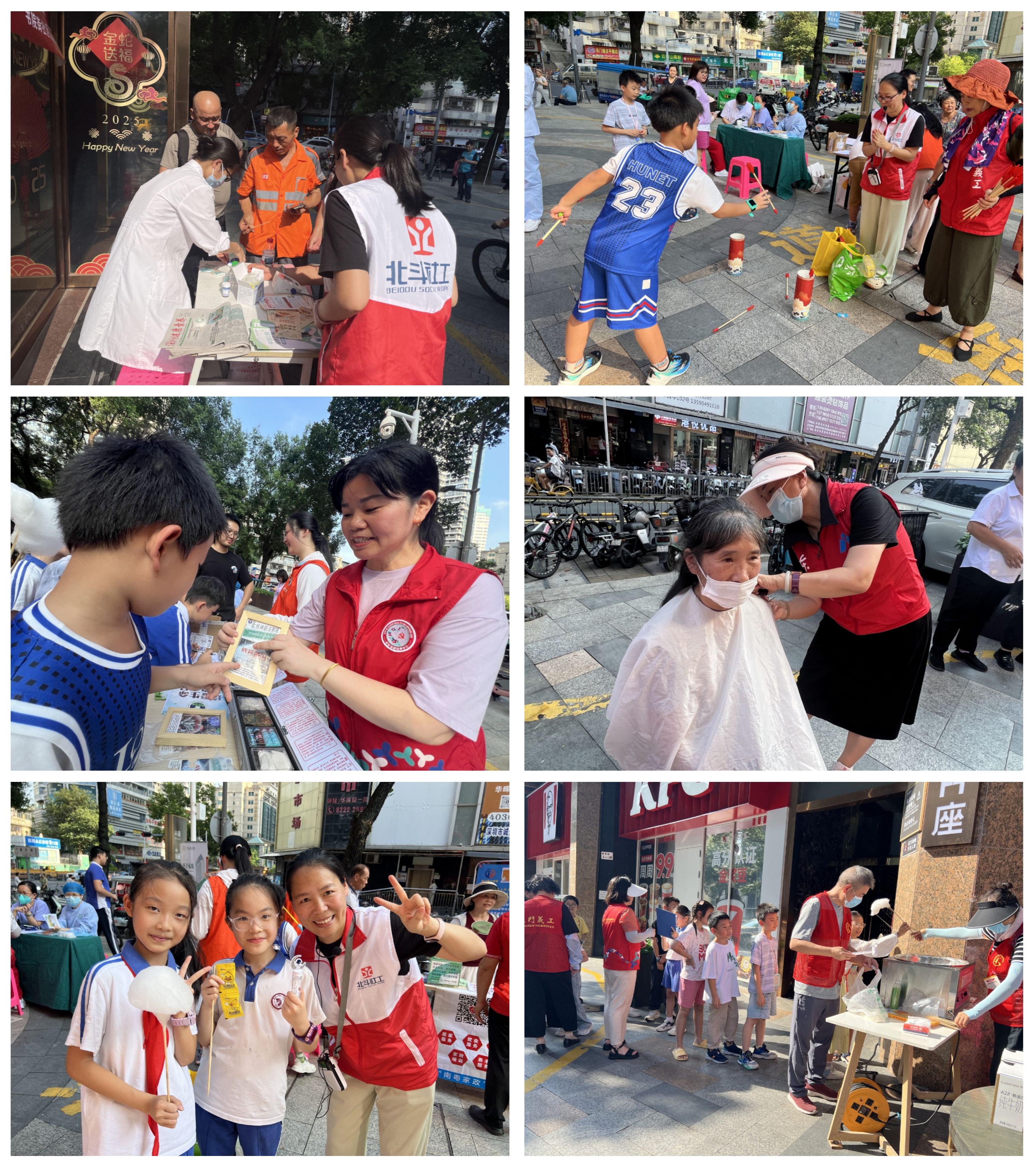 活动现场热闹非凡,各个服务摊位有序排列,社工和志愿者们热情满满地为居民提供服务。在义诊区,专业医护人员耐心地为居民测量血压、血糖、检查口腔、肠胃等,详细询问居民的身体状况,并给予健康生活方式和疾病预防的建议。一位老人在测量完血压后开心地说:“不用去医院就能免费检查身体,社区的服务真是太贴心了!” 理发区同样人气十足,理发师们手法娴熟,根据居民的需求为他们设计合适的发型。从孩童到老人,大家都能在志愿者理发师的巧手下,以清爽的形象迎接美好生活。