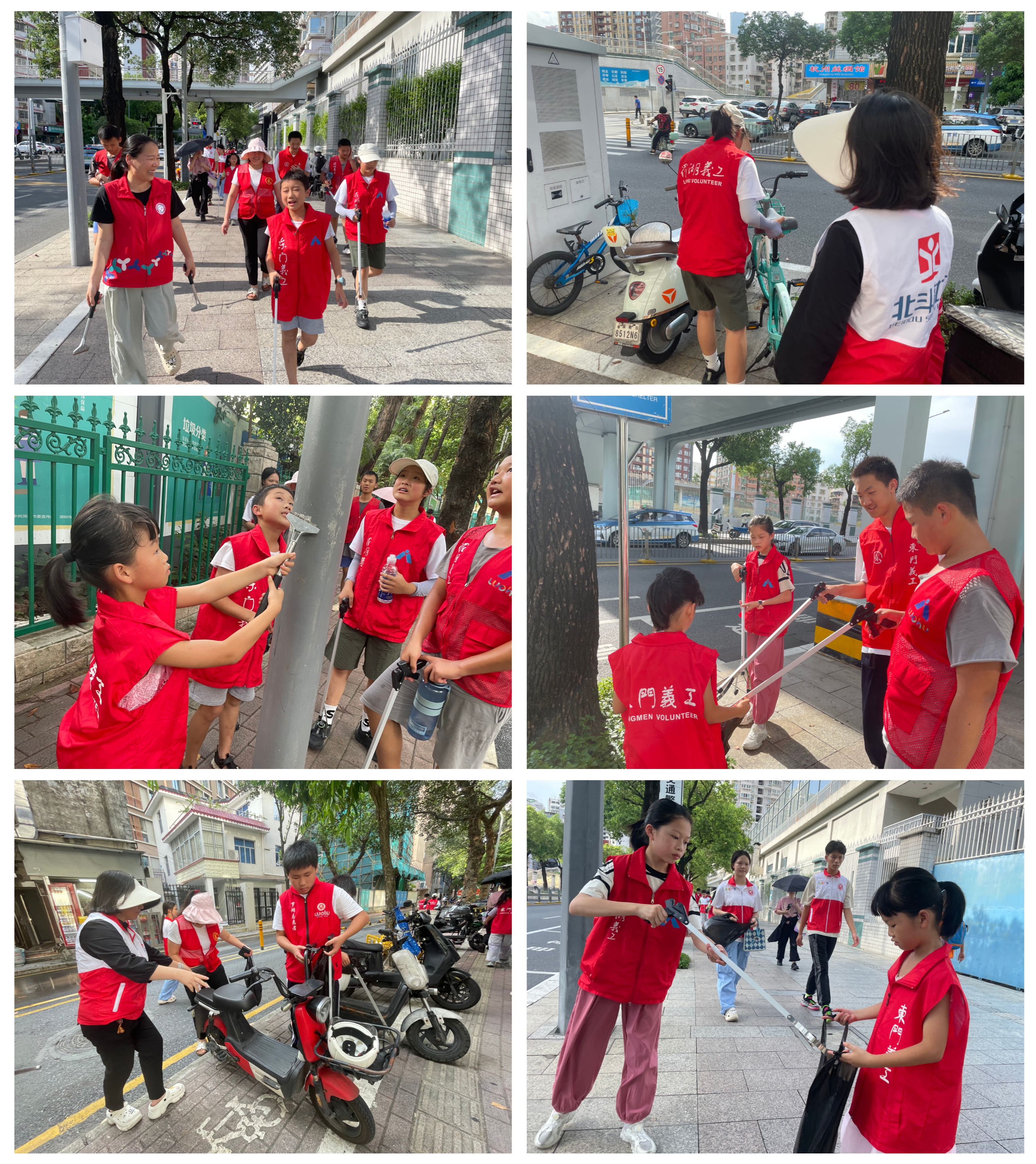 接下来的“家园美化红行动”上,将青少年分成两组,每组由一名社工作为领队。两组青少年志愿者迅速投入“战斗”,面对炎炎夏日,没有丝毫的退却。他们互相配合、干劲十足,弯腰捡拾烟头、清理路面垃圾、将乱停的共享单车和电动车摆放整齐、用小铲子仔细铲除墙面小广告。看着原本杂乱的角落变得整洁,青少年志愿者脸上的露出满满的自豪感。