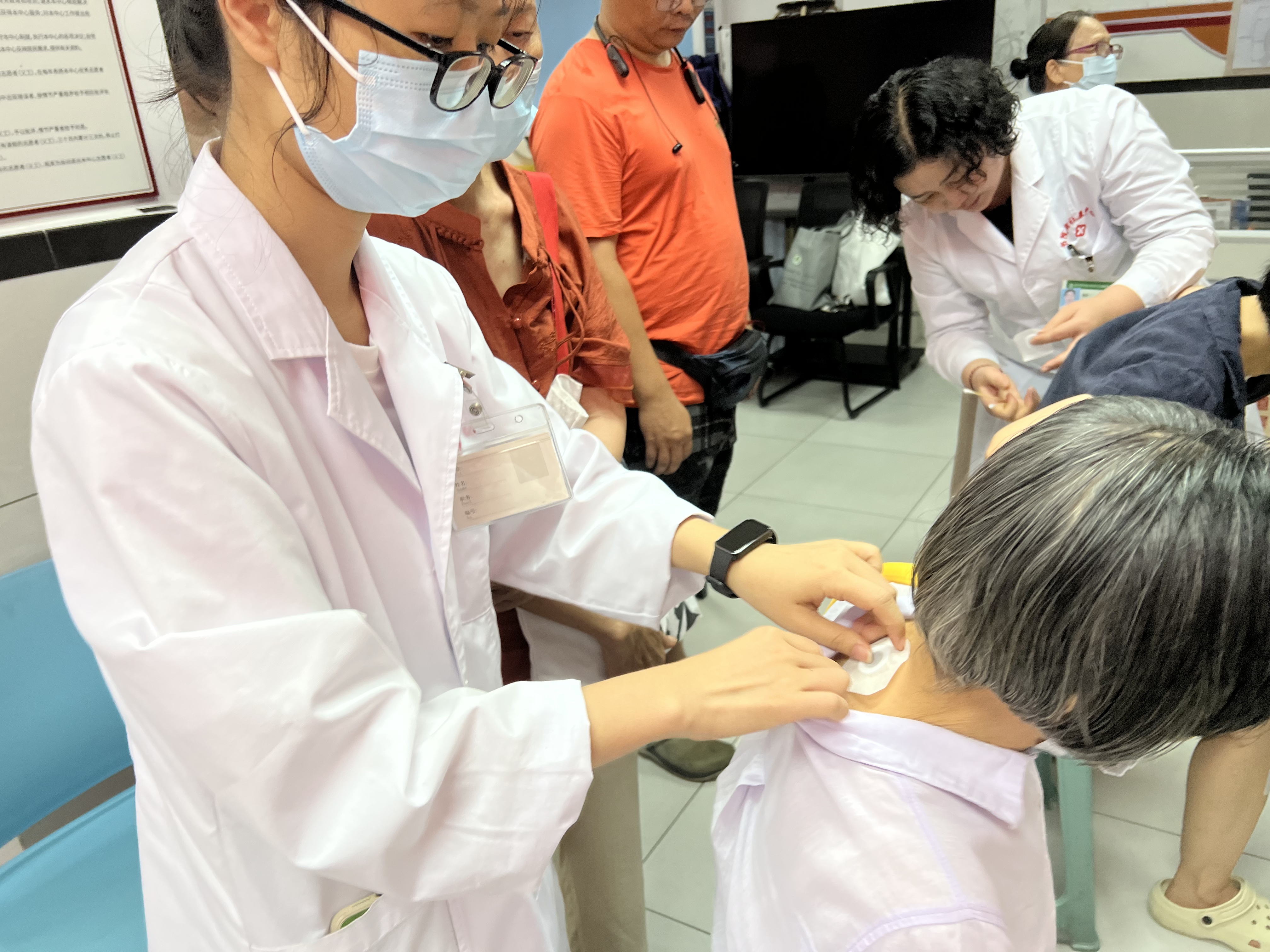 活动特邀社康丰医生结合中医理论,深入浅出讲解三伏贴治病原理,从经络学说、季节养生等角度,剖析夏季阳气旺盛时,通过穴位贴敷调理慢性疾病的科学依据。针对不同体质、常见病症,如慢性咳喘、关节疼痛、脾胃虚寒等,细致指导对症贴敷方法,现场答疑解惑,帮助居民精准掌握适合自身的“三伏贴”使用要点。“以前总觉得三伏天就是要‘大口喝冰’,听了讲座才知道这样对脾胃伤害这么大,真是长知识了!” 社区居民冯阿姨认真地说。