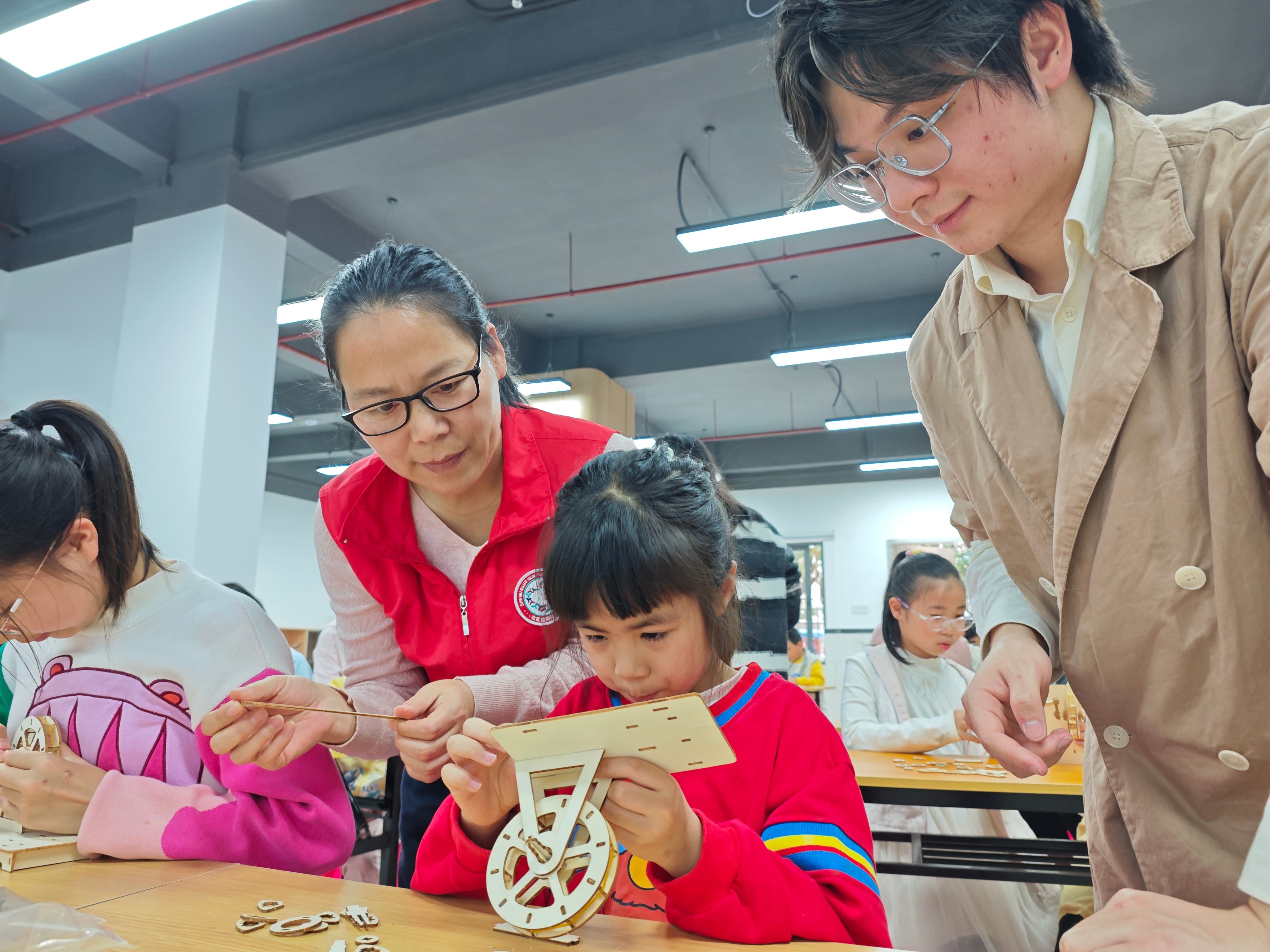 在动手组装环节,孩子们个个兴致高昂、全神贯注,认真对照步骤图辨认电机、齿轮、导线、灯珠等零部件,小心翼翼地进行拼接、固定与接线。面对看似复杂的零件,孩子们耐心摸索、相互讨论,遇到难题主动向老师和社工请教。有的孩子专注地调整齿轮位置,确保传动顺畅;有的孩子细心连接导线,避免接触不良;还有的孩子反复测试手摇力度,观察灯珠亮度变化。从无从下手到熟练操作,从零散部件到完整装置,每一活动现场,社工以“数字令”破冰游戏拉开活动序幕,大家一起分享寒假生活,并向大家讲解“交流电之父”法拉第的故事,号召孩子们学习他永不言弃的科学探索精神和对人类科技发展的无私奉献精神。接着老师用通俗易懂的语言,为孩子们讲解手摇发电的基本原理,生动拆解“机械能如何转化为电能”,并通过生活中的用电场景,让抽象的科学知识变得直观易懂。
