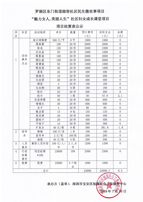 民生微实事“魅力女人,美丽人生”社区妇女成长课堂项目结算表公示