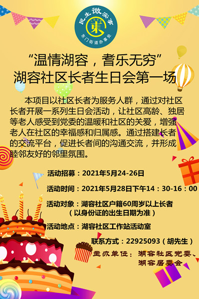 湖容社区民生微实事项目“温情湖容,耆乐无穷”湖容社区长者生日会活动招募