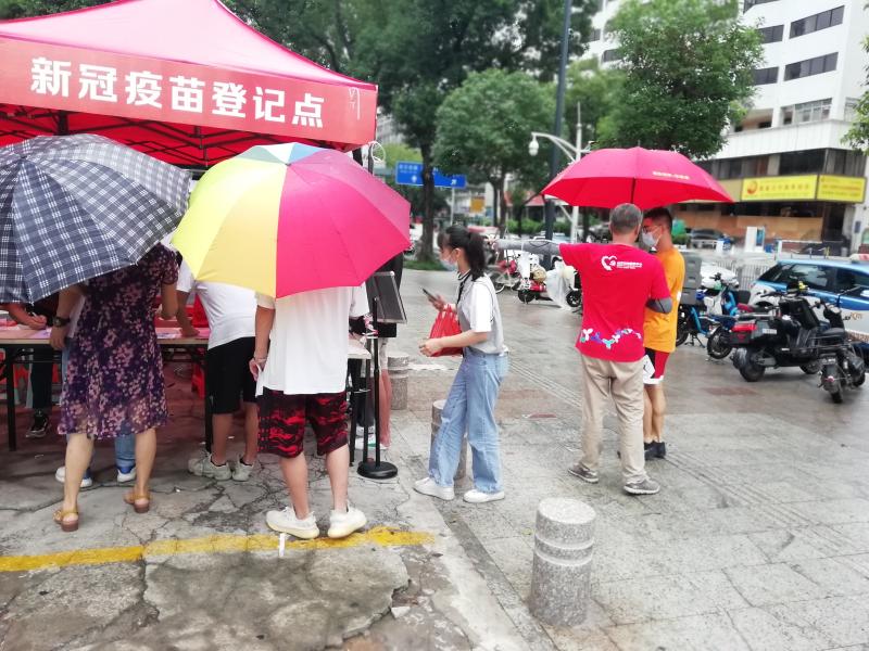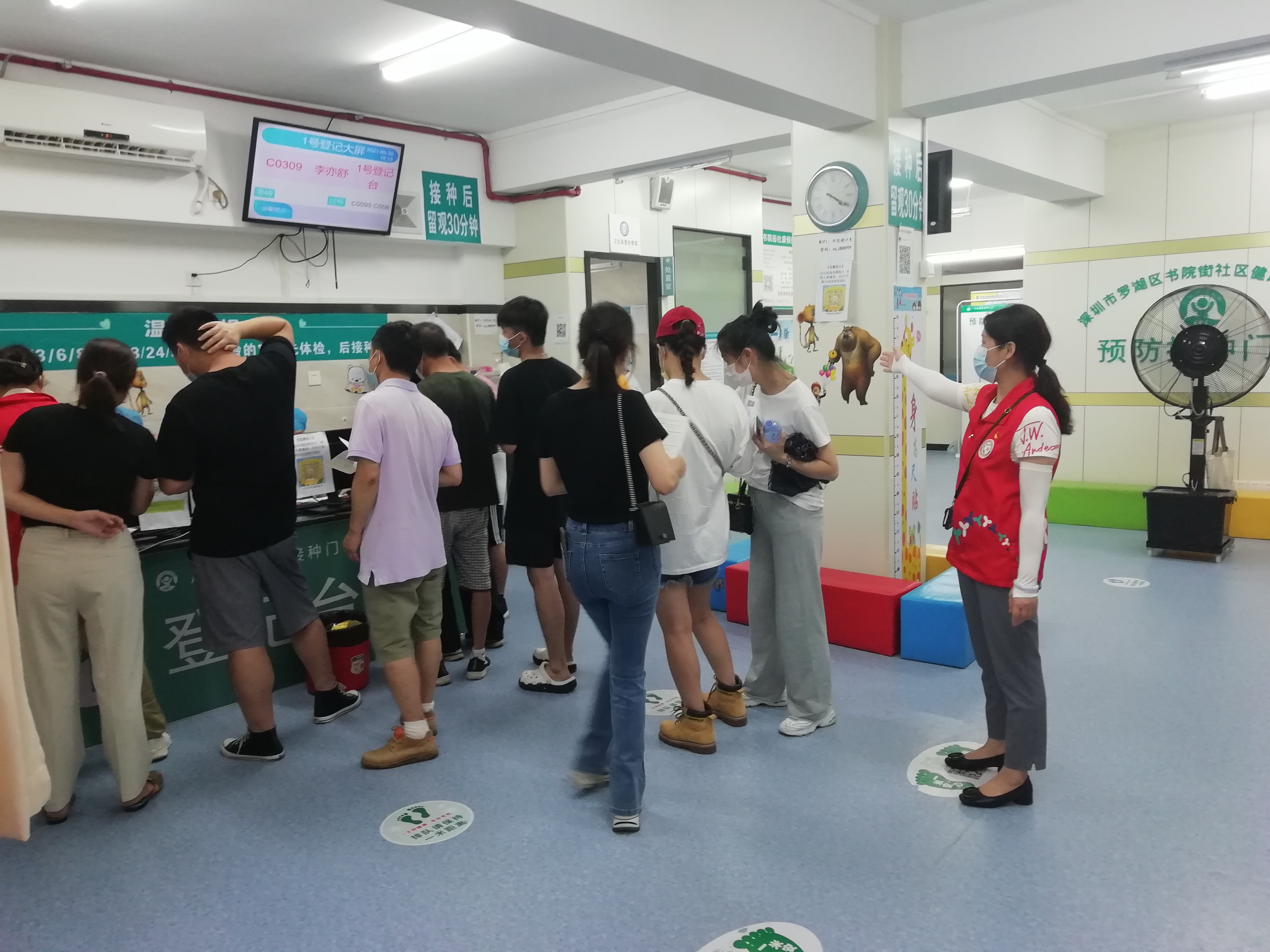 5月29日,湖容社区到书院街社康支援疫苗接种工作,引导群众有序排队接种新冠疫苗。