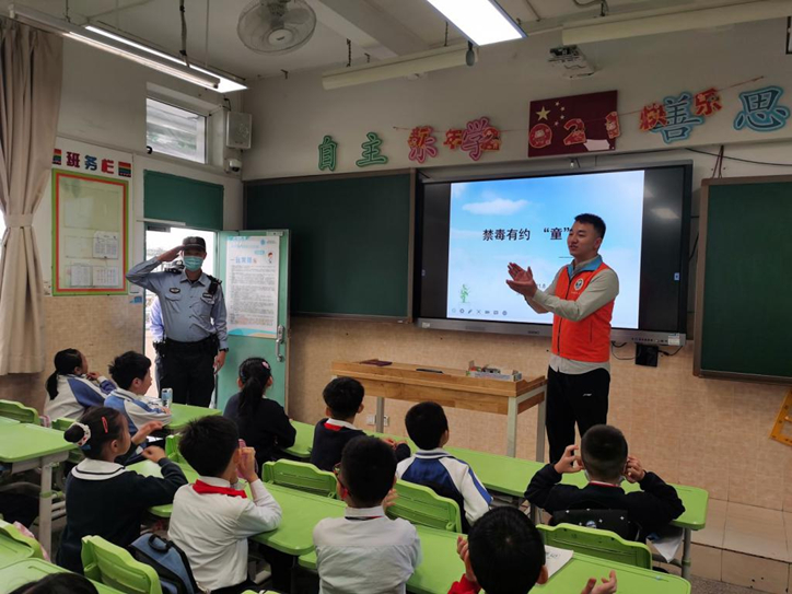 罗湖家园网讯:11 月 8 日,湖容社区携手公安、社会心理公益服务团队来到辖区湖贝小学,开展小学生禁毒宣传主题班会课。旧村警务室警长钟曾荣作为学校的法制辅导员,为同学们介绍了此次班会课的禁毒主题内容。通过活动不断增强学生对毒品危害的认识,从而提高防毒意识。