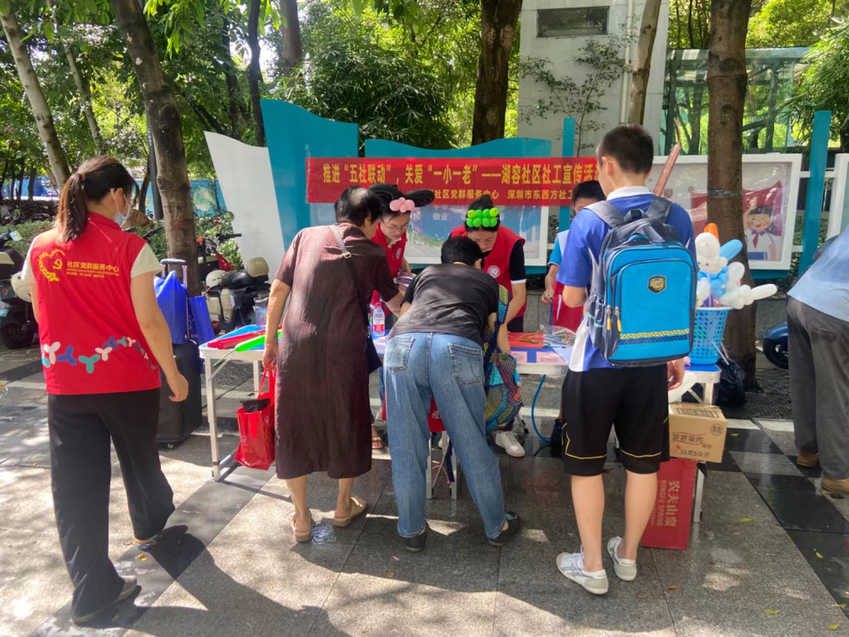 罗湖家园网讯:为进一步宣传社会工作专业作用,展示社会工作发展成果,7月12日下午,湖容社区党委、湖容社区文明实践站、深圳市东西方社工服务社驻湖容社区党群服务中心社工组织开展了“推进五社联动、关爱一老一小、湖容社区社工宣传活动”。