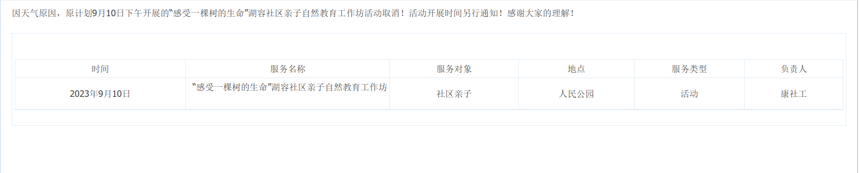 罗湖家园网讯:因天气原因,原计划9月10日下午开展的“感受一棵树的生命”湖容社区亲子自然教育工作坊活动取消!活动开展时间另行通知!感谢大家的理解!