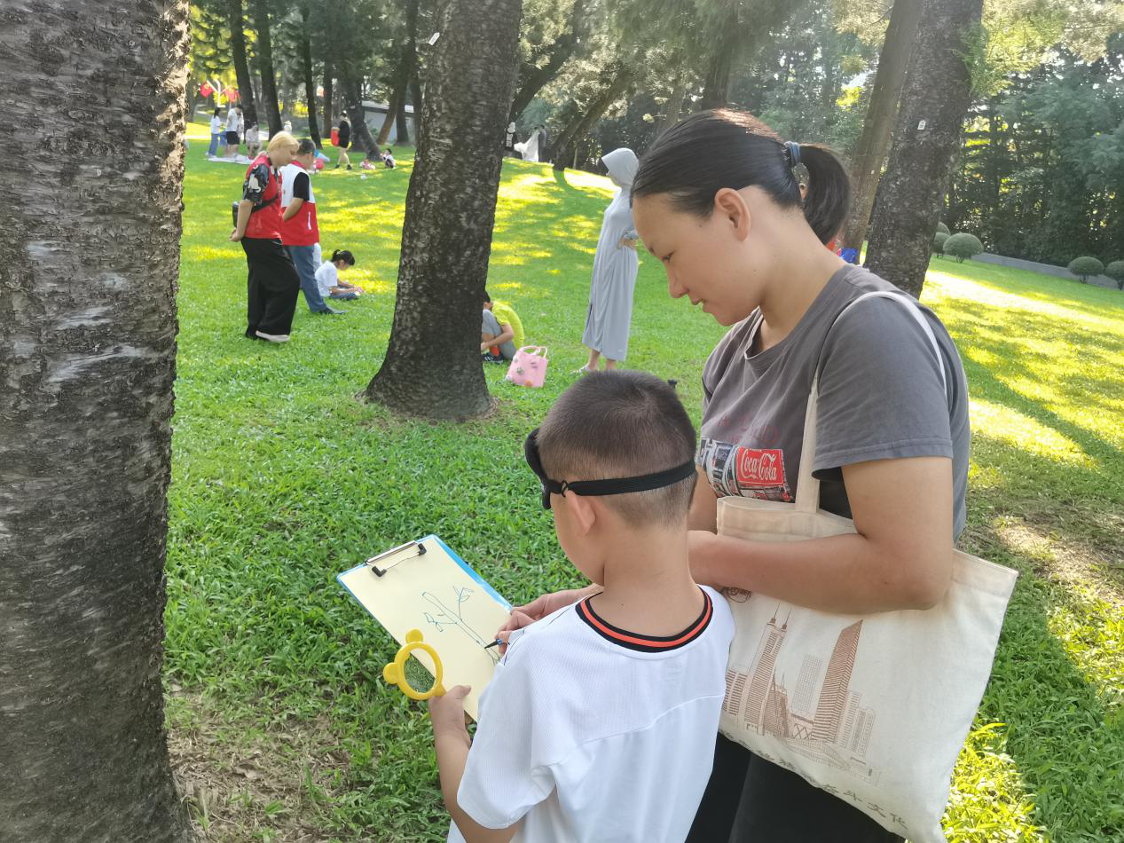 活动开始前,家长孩子们早早到达现场签到,等参与者到齐后,社工开始宣讲活动流程。随即就开始了感受一棵树的自然之旅。只见妈妈带孩子兴致高昂找到属于自己的一棵树并戴上眼罩,用手拥抱树干测量树的粗壮,抚摸树皮表面上的纹理,接着摘下眼罩拿出放大镜,仔细观察树木的树轮、树叶等。最后,拿出纸笔画板在亲子互动有商有量当中描绘属于自己的树,不一会儿,大家纷纷描绘出一棵棵带有独自特色的大树,现场氛围高涨主动分享,共享亲子欢乐时光。