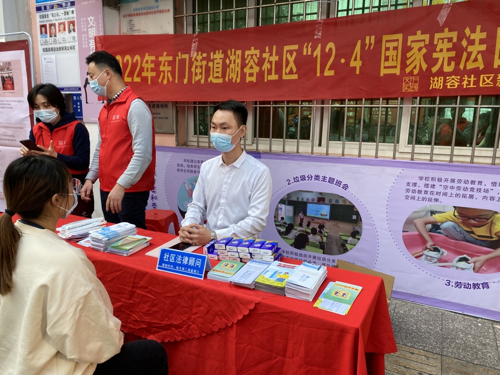 罗湖家园网讯:今年12月4日是第九个国家宪法日,也是我国现行宪法公布施行四十周年。2022年全国“宪法宣传周”宣传活动从12月4日启动,持续至12月10日。在此期间,湖容社区新时代文明实践站邀请社区法律顾问于12月9日下午在湖贝小学门口开展2022年“12·4”国家宪法日宣传活动。