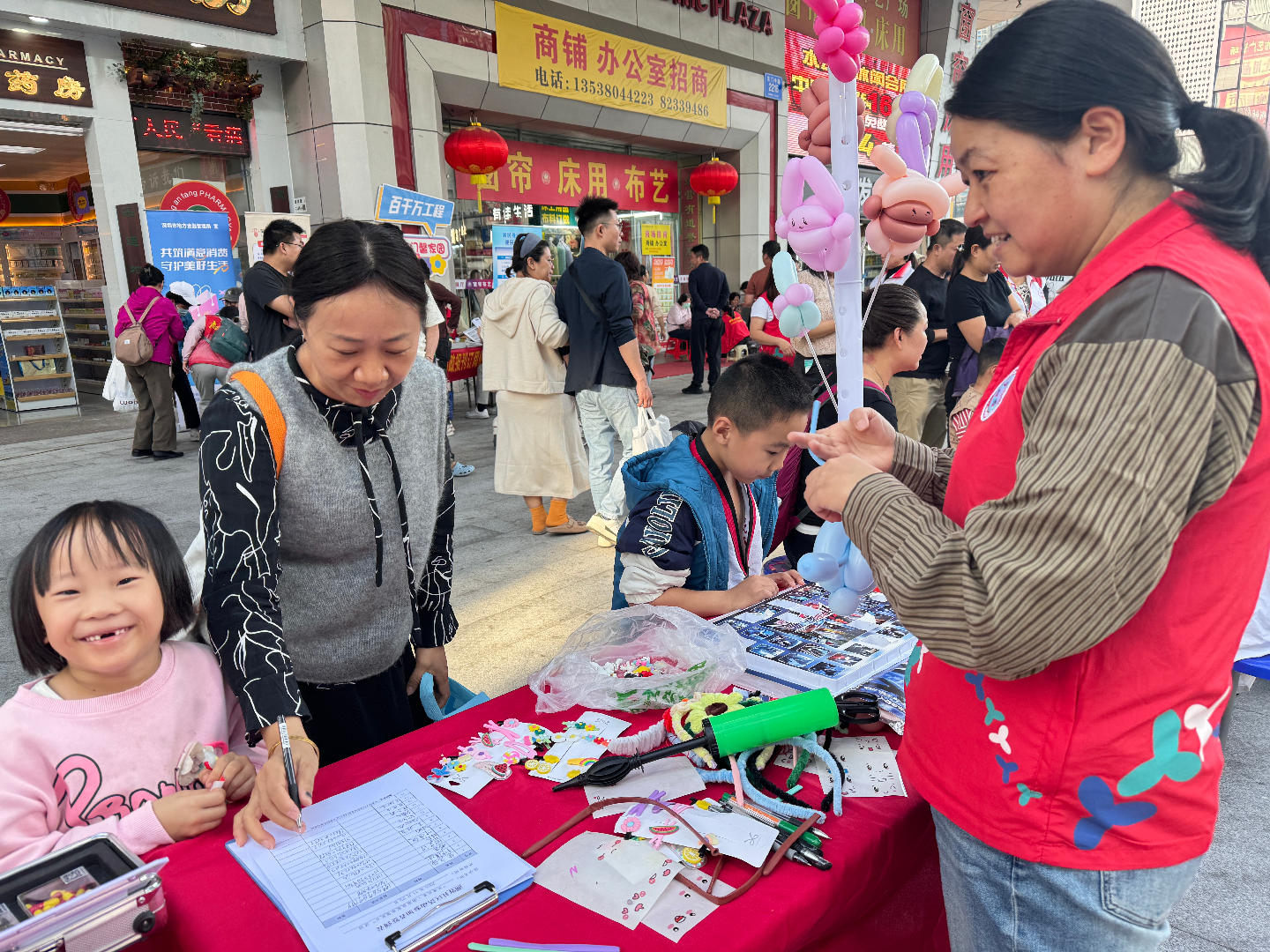 各服务摊位前秩序井然,居民们根据需求从容穿梭,现场洋溢着温暖而热烈的气氛。义诊区内,医护人员轻柔地为老人测量血压、血糖,耐心解答健康疑问,传递着无微不至的关怀;按摩摊位前,志愿者们手法娴熟、动作轻柔,为疲惫的身心注入舒缓与放松;政策咨询台边,工作人员细致解读每一条社区服务政策,用专业与真诚传递政策的温度。每一个服务窗口,都承载着社区对居民细致入微的关爱。活动现场还特别设置了花样气球互动游戏环节,孩子们在五彩斑斓的气球间尽情玩耍,于欢乐中汲取知识,大人们则在交流间拉近了距离。清脆的欢笑声此起彼伏,不仅点亮了整个活动现场,更让社区共同体的意识在无形中生根发芽。
