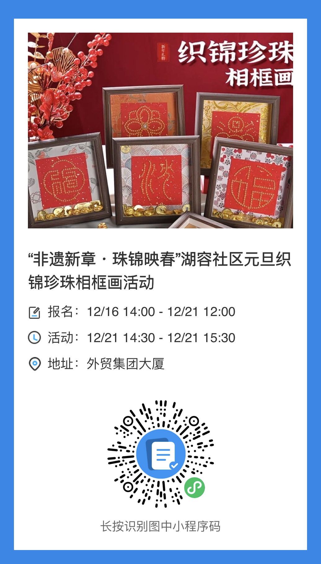 【活动招募】“非遗新章・珠锦映春”湖容社区元旦织锦珍珠相框画活动招募啦!欢迎大家踊跃报名哦!