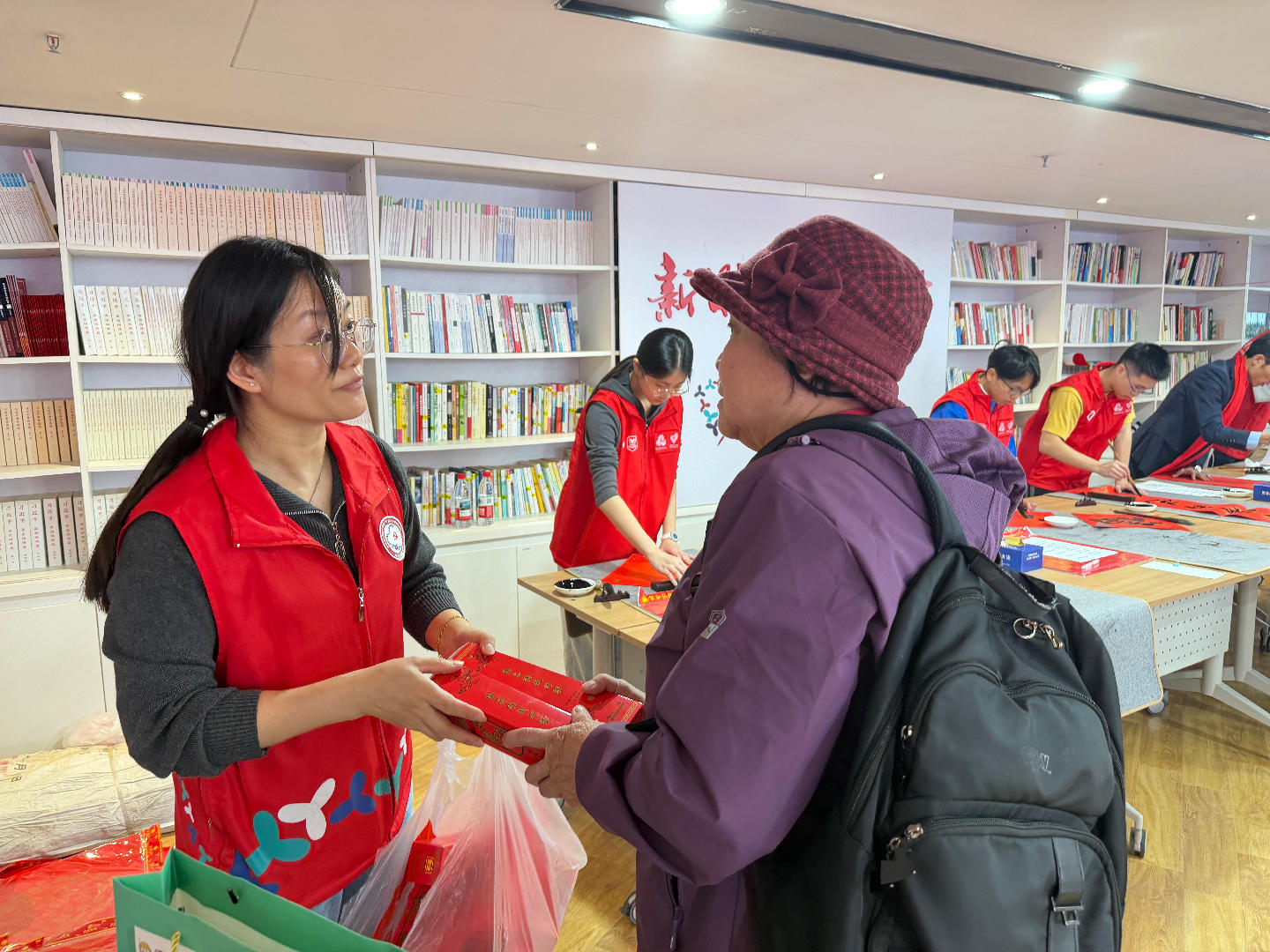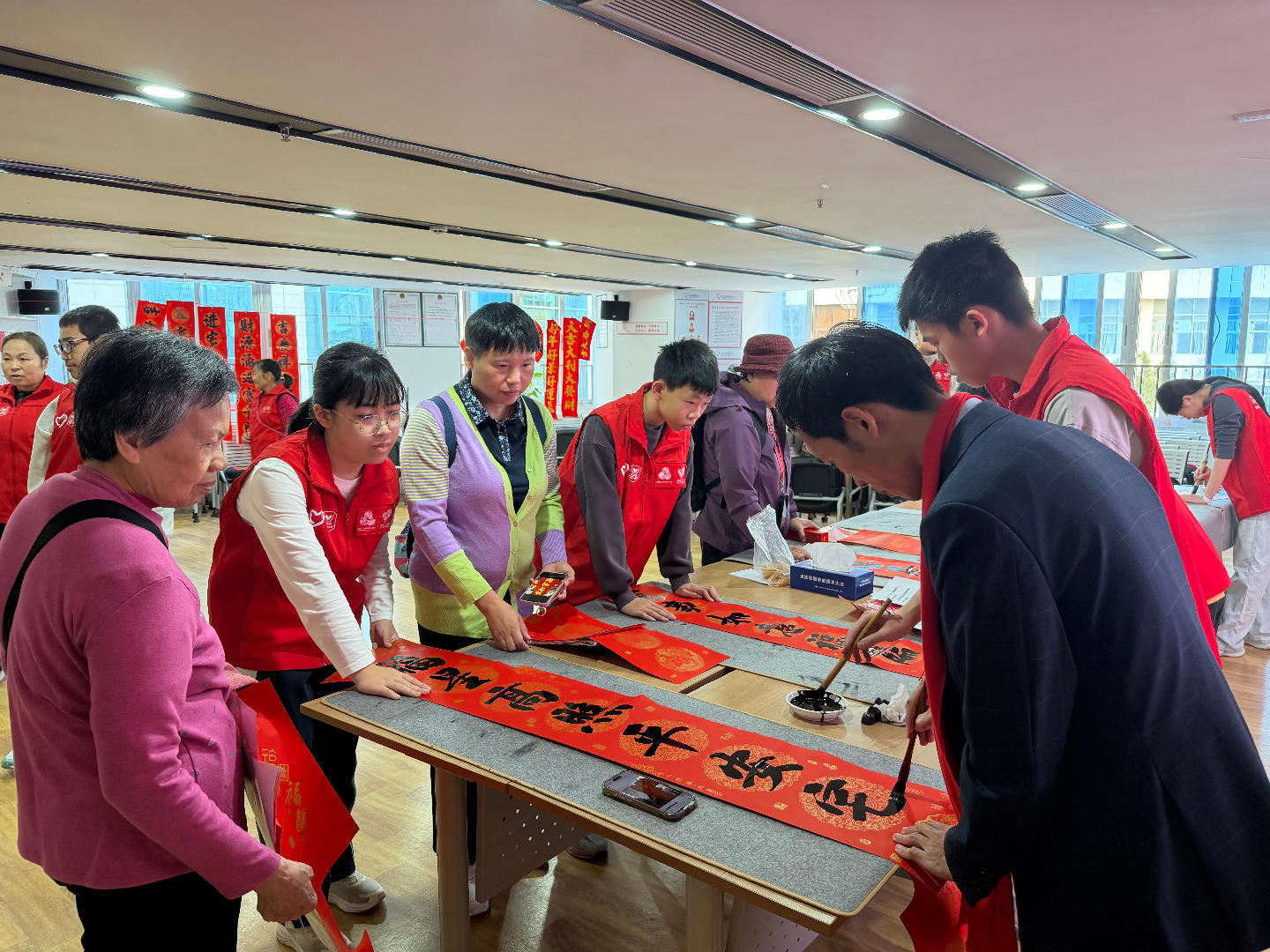 身着红色义工服的志愿者构成亮丽风景线。他们有序协助铺纸、研墨,细心摆放春联防墨迹晕染,还主动与居民互动,询问心仪对联内容并引导有序领取,助力大家快速拿到祝福。