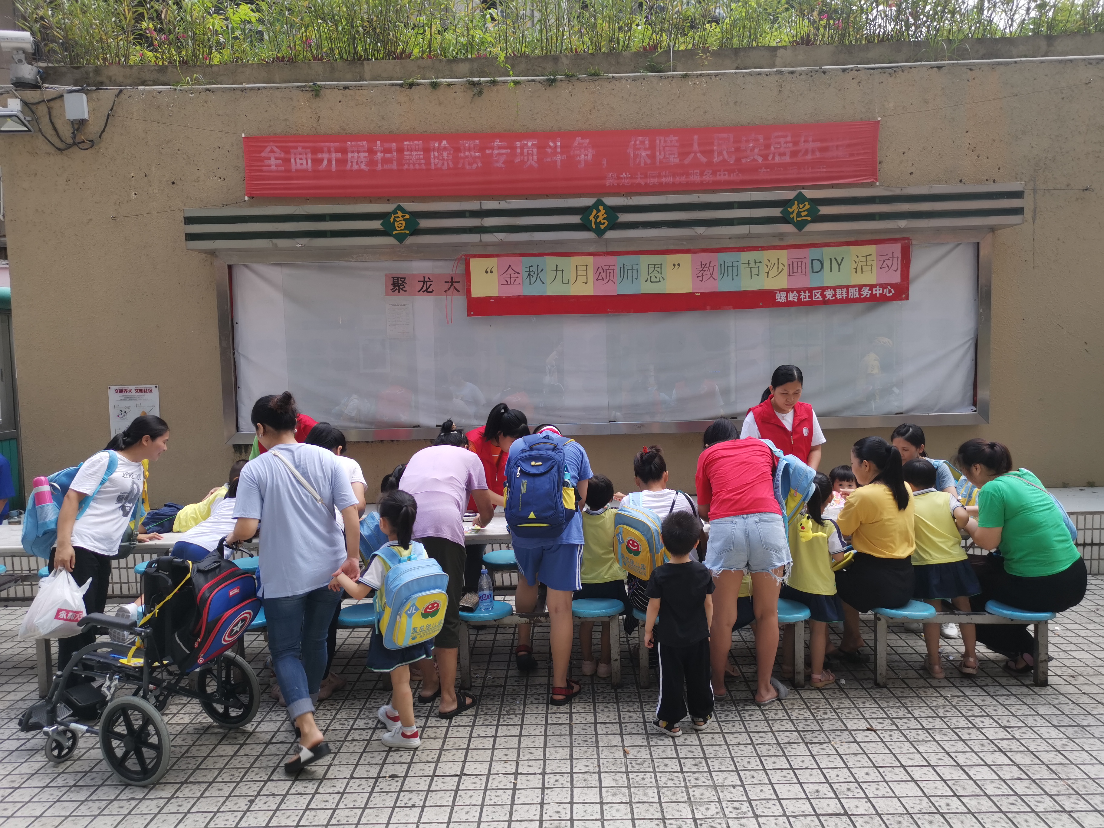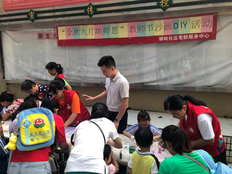 一曲赞歌唱不尽您的华丽的篇章,一支粉笔却写就了您的人生轨迹;三万桃李报答不了您的如山恩情,三千青丝染霜却谱写出您的精彩人生。教师节来临之际,螺岭社区党群服务中心于2019年9月9日下午15:30-17:30,在聚龙大厦广场开展了“金秋九月颂师恩”教师节沙画DIY活动。