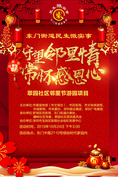 罗湖家园网讯:2019年罗湖区东门街道民生微实事翠园社区邻里节游园项目将于2019年10月24日下午三点,在东门中路2110号缤纷时代家园内开展,欢迎大家踊跃到场参与!