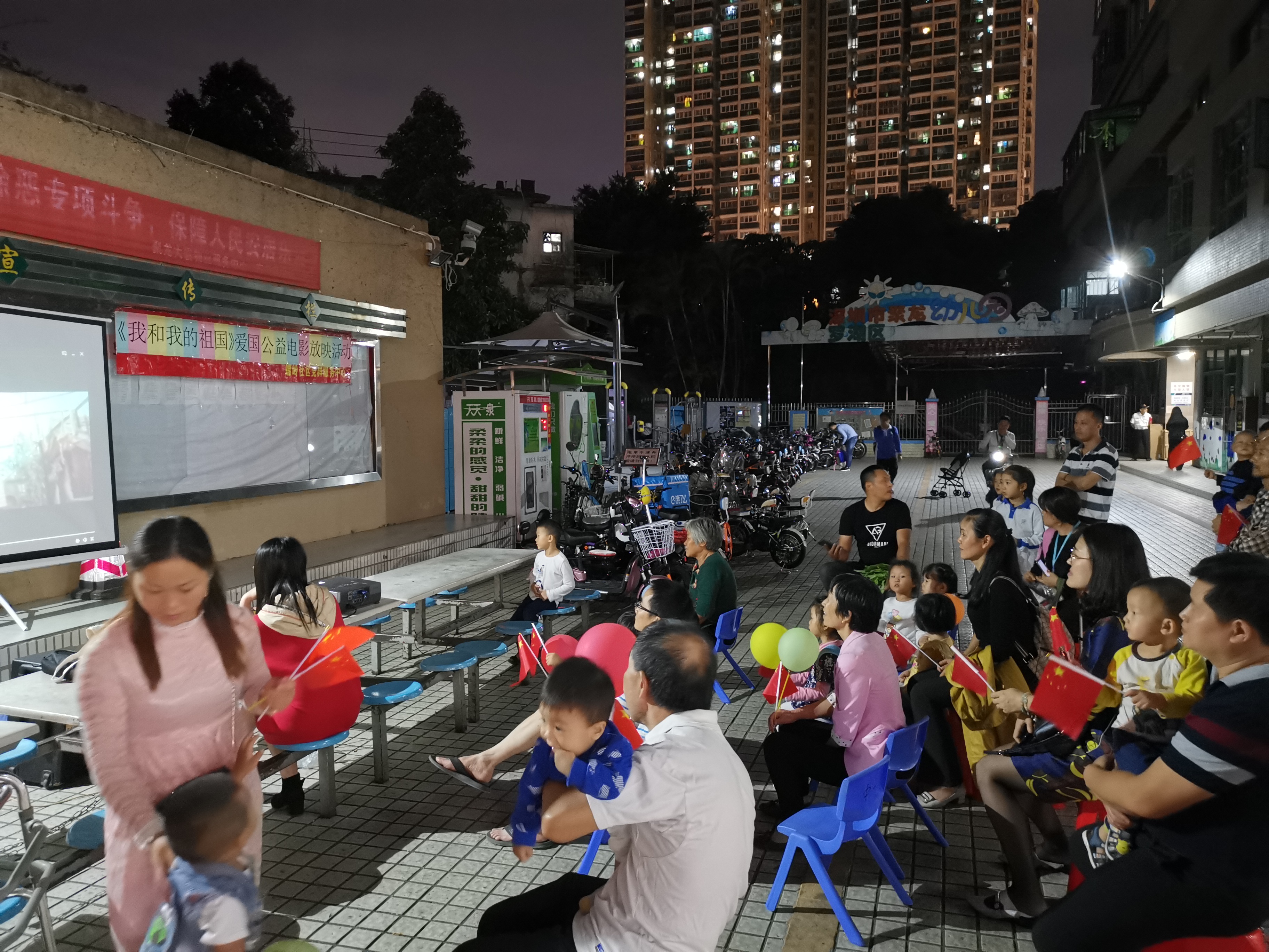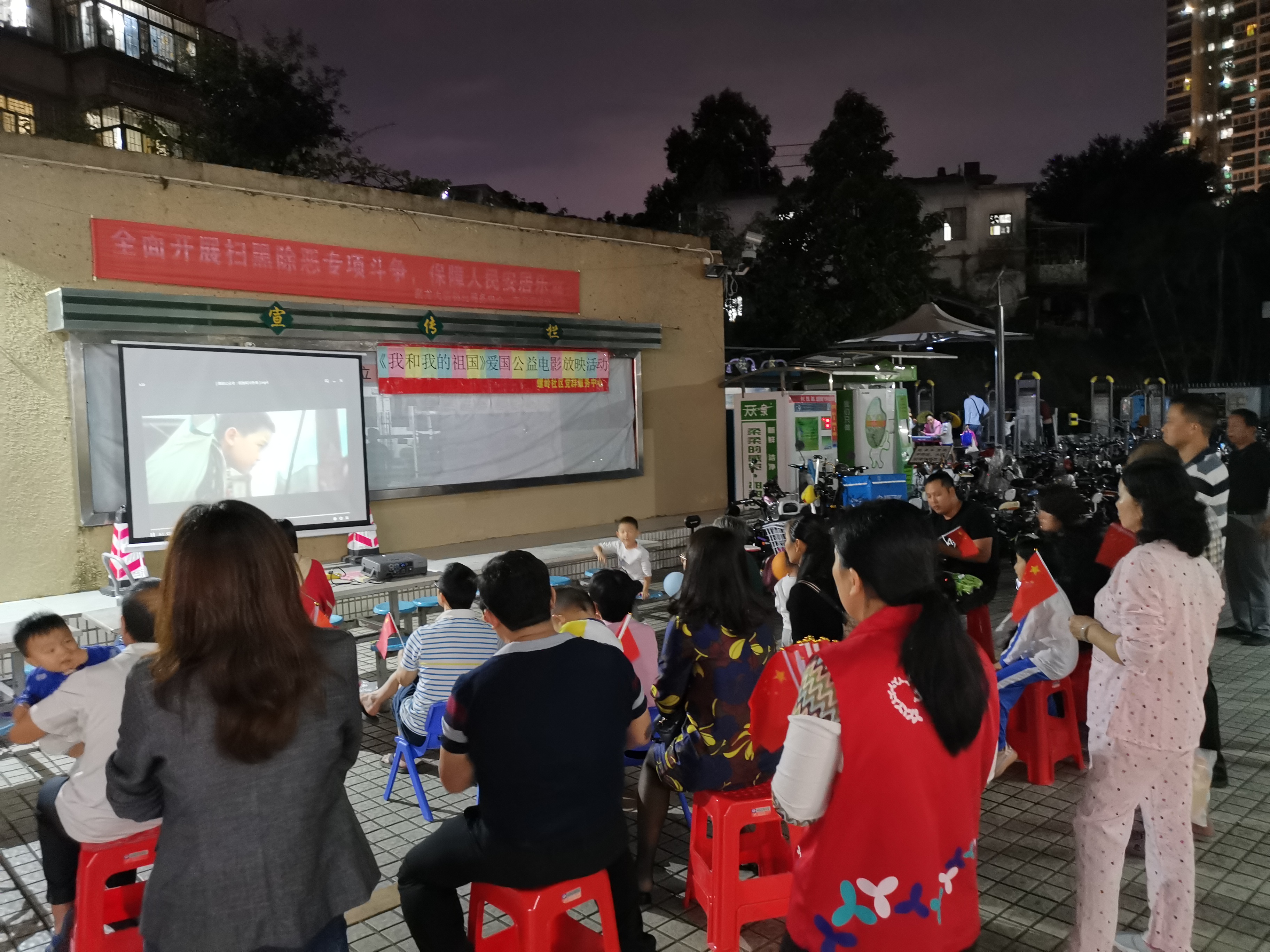 螺岭社区党群服务中心于2019年10月31日晚上18点在社区聚龙大厦广场开展《我和我的祖国》爱国公益电影放映活动。