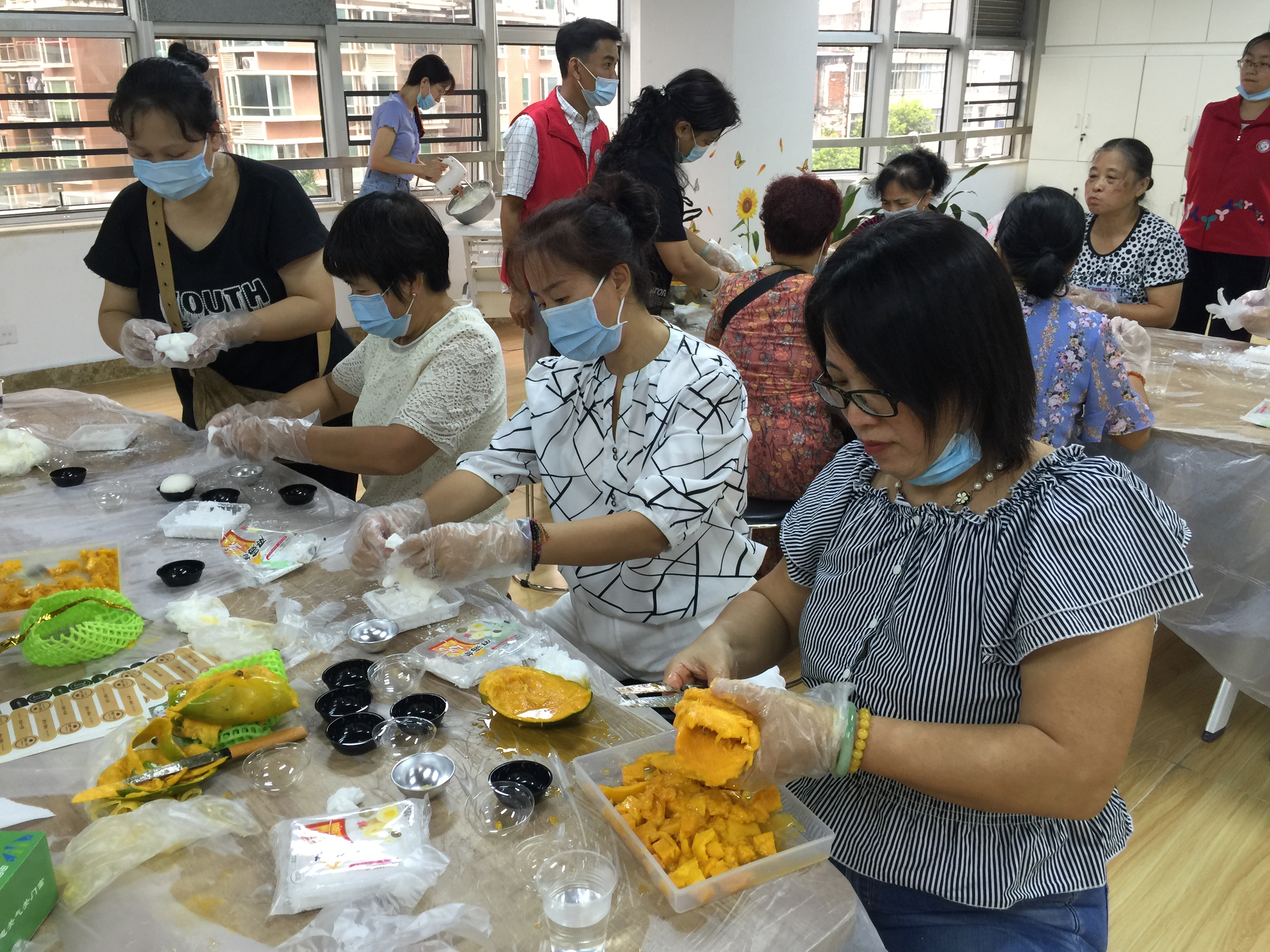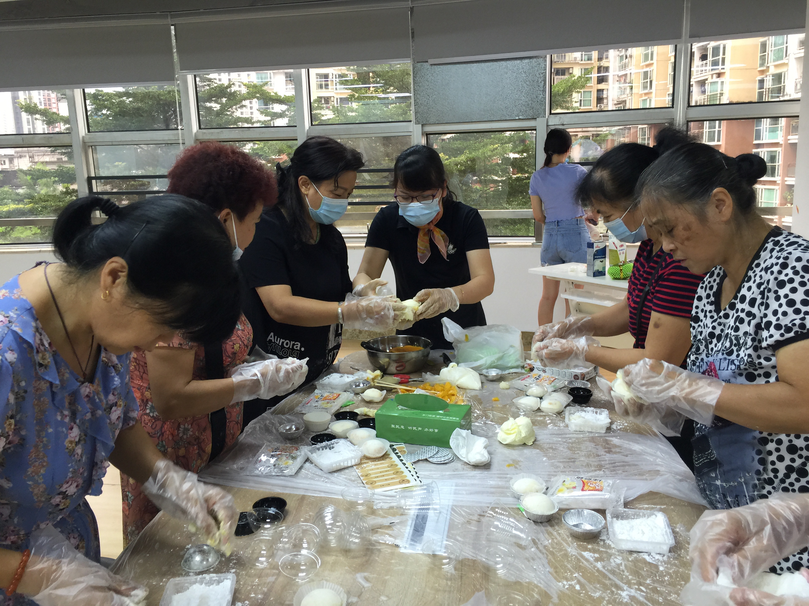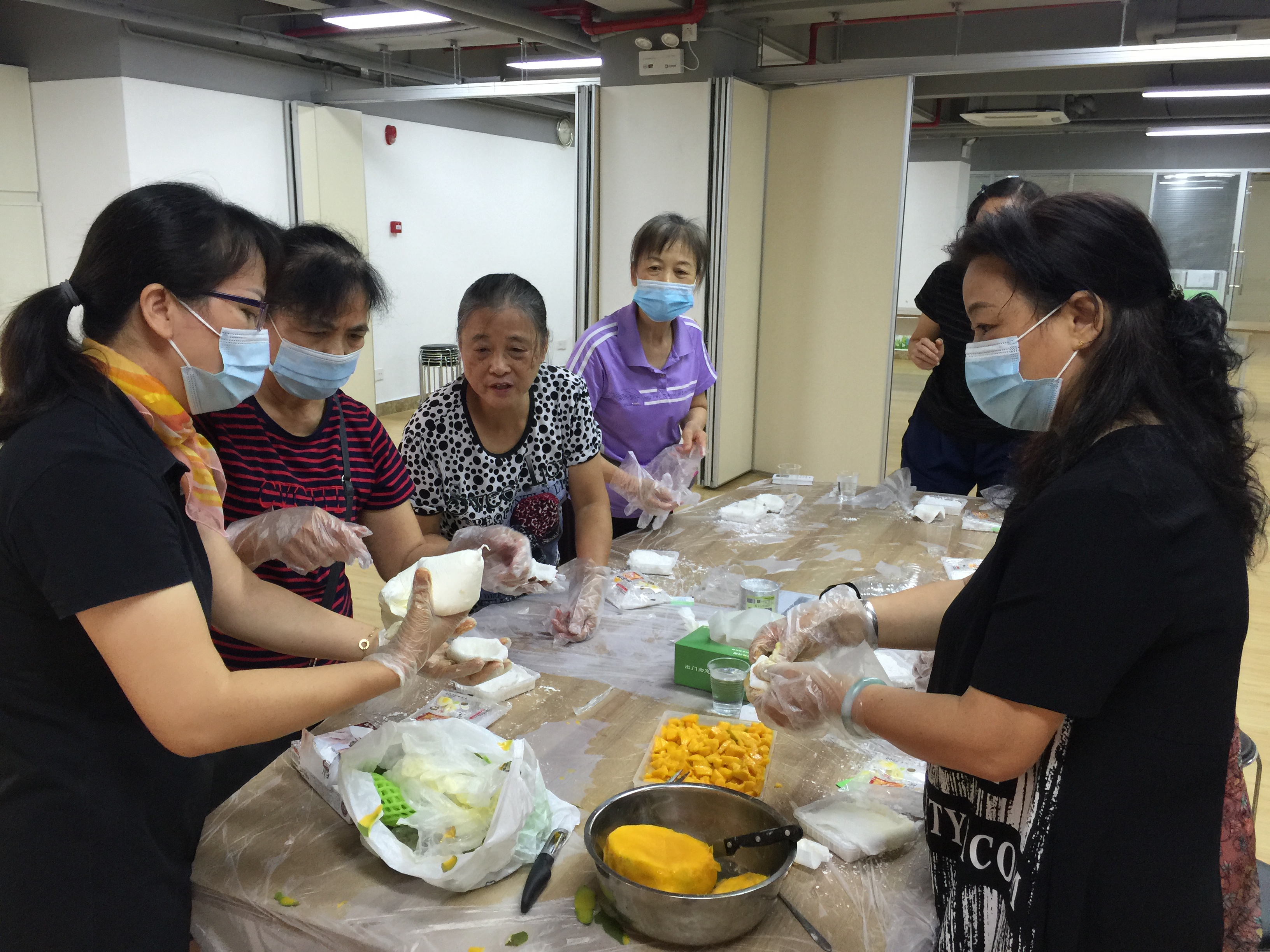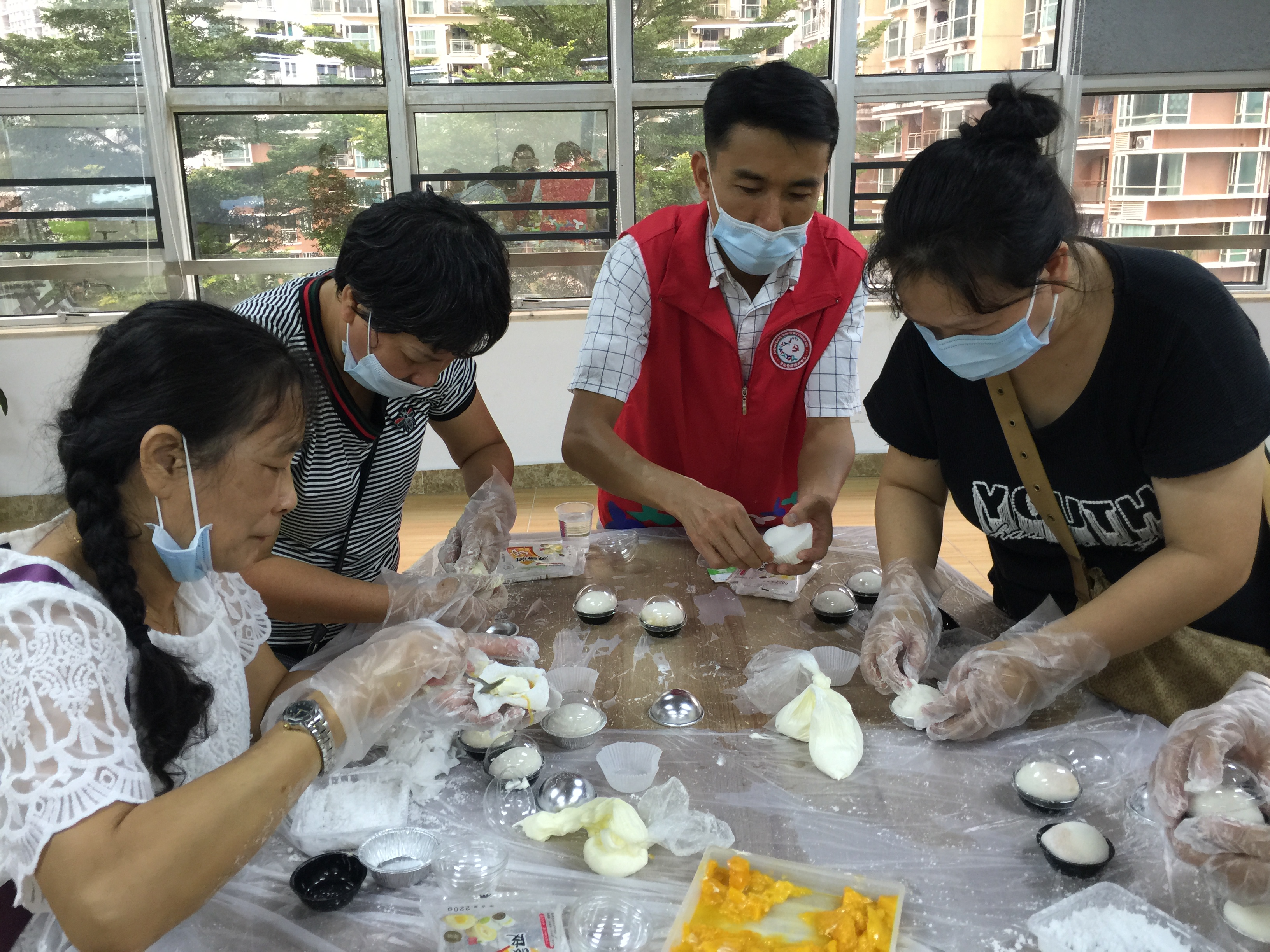 活动开始,义工张老师首先向居民们介绍了制作材料,并现场演示了如何制作雪媚娘。在老师和社工的指导下,居民们纷纷动起手来,大家分工明确、细致有序,切水果打奶油、将打制好的奶油及芒果粒放入皮中并放进模具,接着再将对角分别捏紧粘合,最后将整个底部封口捏牢包起来就成功了,一个个“月圆”模样的雪媚娘就成型了。参与者杨姨:“原来制作雪媚娘饼这么简单,做完后可以马上就吃,软糯香甜的皮加上顺滑的奶油,一口咬下去,一级棒。”各位居民希望社区以后多一些此类型的活动,因为平时真的是很少机会这样聚在一起聊聊天,做做美食,他们都说感谢义工和社工们在中秋节来临之际对大家的关爱。