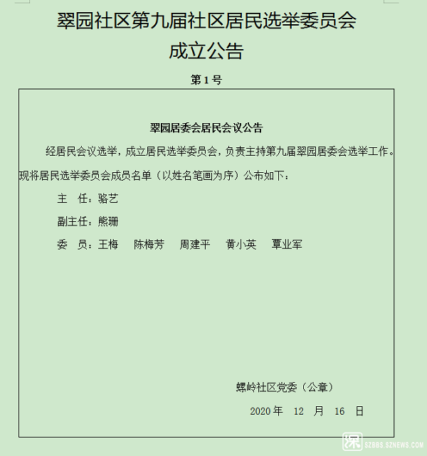 翠园社区第九届社区居民选举委员会 成立公告