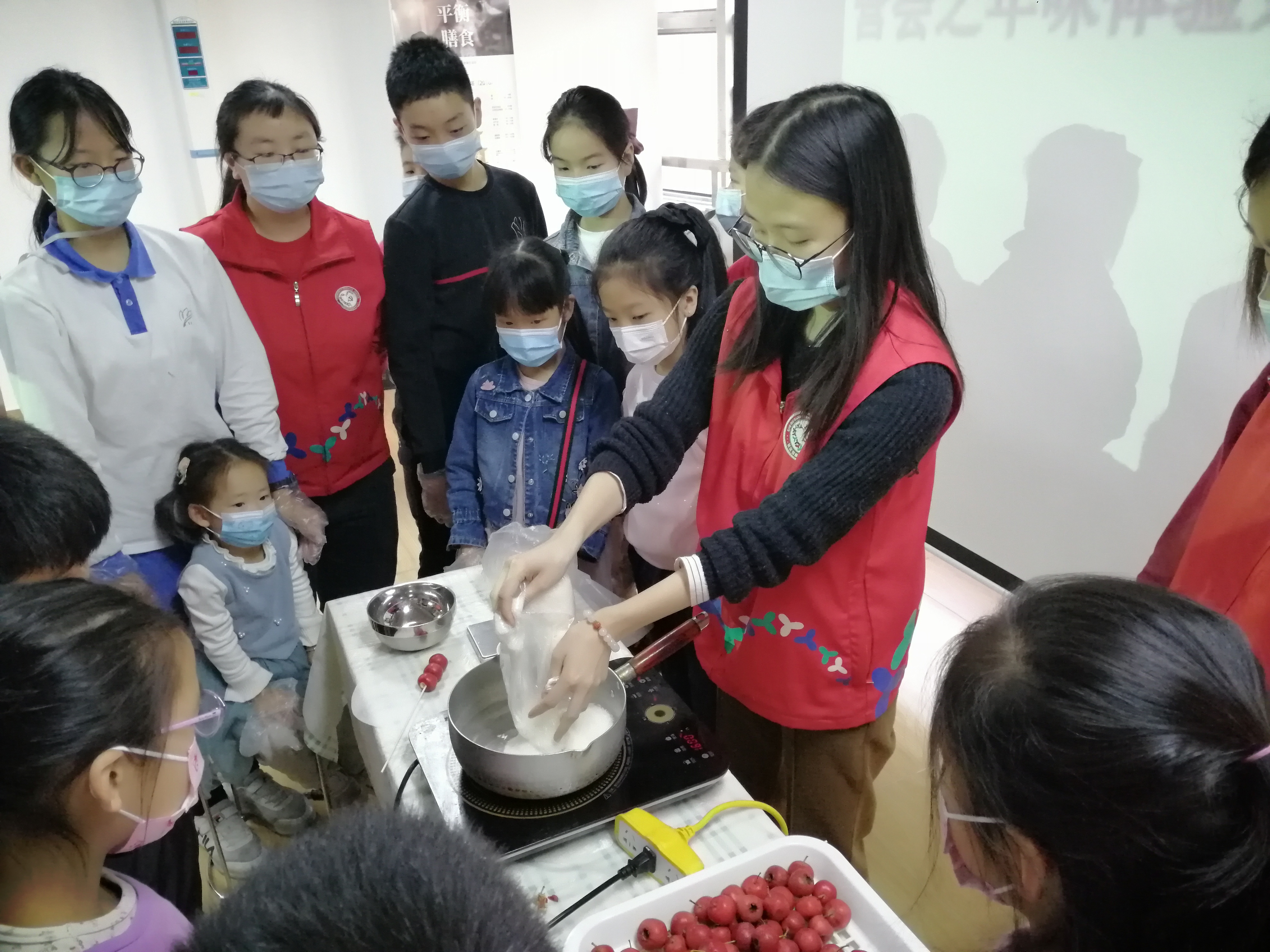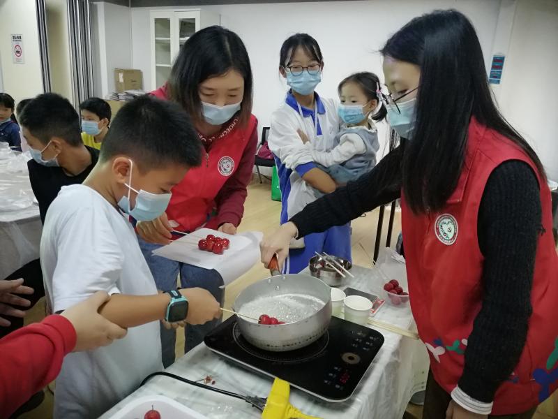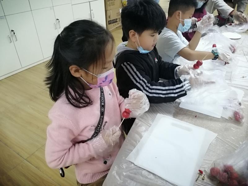 此次年味体验活动第一场的主题是学习制作糖葫芦,活动伊始,在经过一轮年味主题的“你画我猜”的游戏后,便开始了糖葫芦的制作。社工先做好安全及卫生注意事项的提醒,便开始教授如何串山楂、用糖水比二比一的比例开始熬糖,参加者们通过观察糖色、糖泡及糖浆硬度的变化,耐心地等待糖水变成糖浆、糖砂的过程,最后将提前做好的山楂串,裹上一层香甜的糖衣,一串串红彤彤的冰糖葫芦就新鲜出炉了。