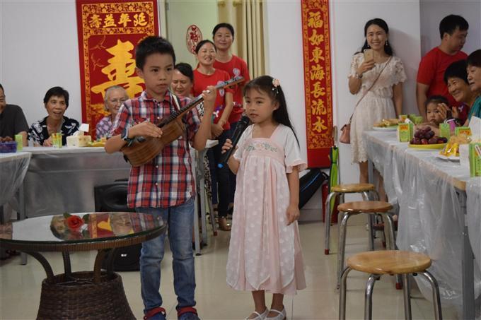 活动在主持人亲切的祝福声中拉开序幕。孩子们也带来了丰富多彩的节目,以此来表达对爷爷奶奶的美好祝愿。儿童尤克里里弹唱《茉莉花》和《生日快乐》给爷爷奶奶送去了甜蜜的祝福;诗歌朗诵《感恩父母》情真意切,全场为之动容;魔术表演《千里眼》和《吉祥四宝》更是赢得掌声不段;最后寿星们的双人水兵舞《阿哥阿妹》把现场气氛推向了高潮。