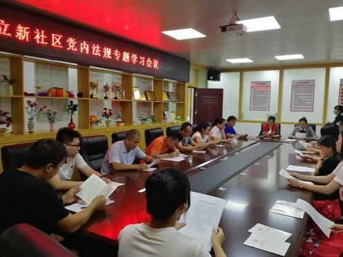 8月22日下午,立新社区党委在社区多功能会议室召开了党内法规专题学习会议,立新社区党委委员、立新社区工作站支部全体党员、积极分子及部分在职工作人员参加学习。会上,立新社区党委书记张小英同志,带领大家集中对《关于新形势下党内政治生活的若干准则》、《中国共产党廉洁自律准则》、《中国共产党纪律处分条例》、《中国共产党问责条例》、《中国共产党党内监督条例》、《中国共产党巡视工作条例》的内容进行了系统学习。通过学习,进一步提高了党员干部职工的政治思想觉悟和遵纪守法自觉性,加深了对党纪党法党规的认识,更加适应守纪律、讲规矩的新常态。