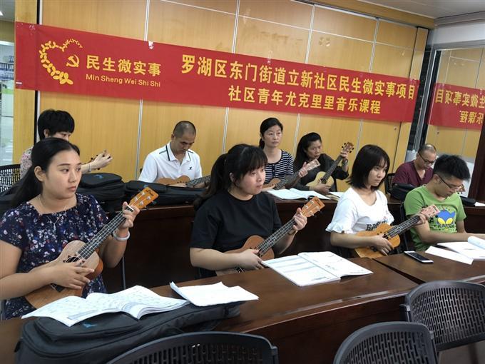 立新社区为了丰富社区青年人的娱乐文化生活,培养音乐素养,建立青年人沟通交流分享音乐的平台,于2018年7月-9月间开展了民生微实事项目“立新社区青年尤克里里音乐课程”。带领社区青年走进尤克里里,体会了乐器的神奇魅力。尤克里里是近年来逐渐风靡的一种夏威夷四弦琴,不仅小巧可爱,简单易学,更是一种可以激发节奏潜能的乐器。成年人学习尤克里里不仅可以培养艺术兴趣,提升音乐素养,更可以以缓解疲劳,释放压力,感受音乐传递的快乐,建设幸福家庭,打造和谐社区。