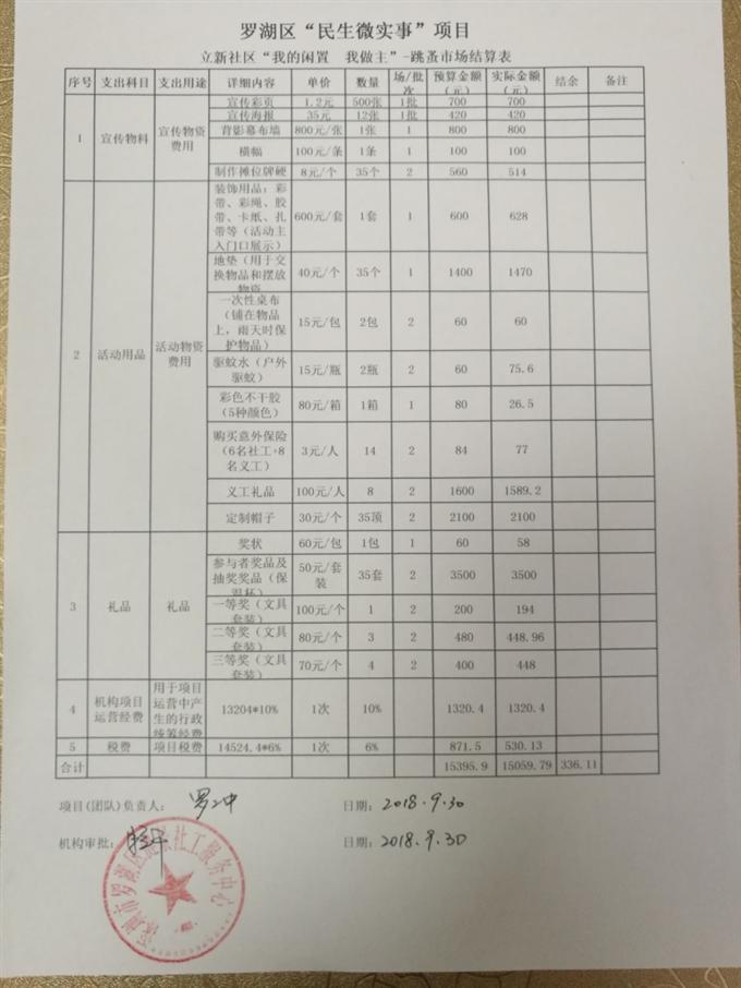 罗湖区东门街道立新社区民生微实事项目——立新社区“我的闲置 我做主”-跳蚤市场结算表