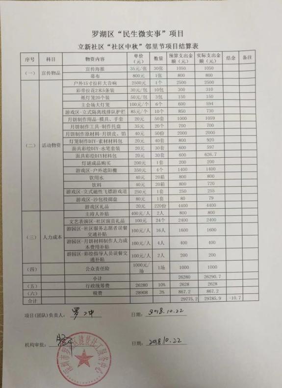 罗湖区东门街道立新社区民生微实事项目——立新社区中秋邻里节结算表