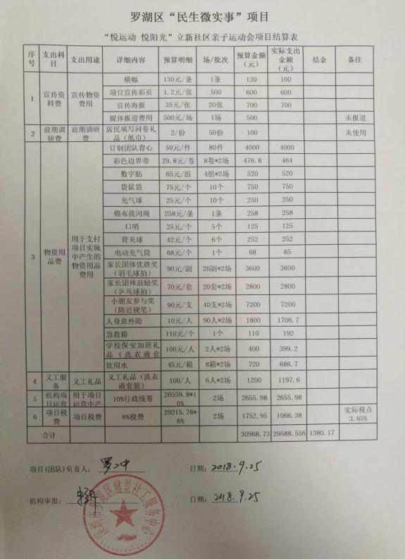 罗湖区东门街道立新社区民生微实事项目——“悦运动 悦阳光”立新社区亲子运动会结算表