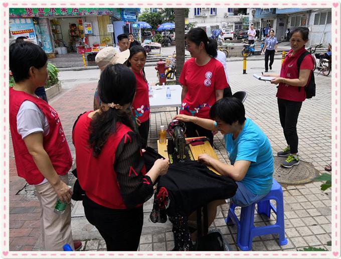 任义工听说了我们这次的便民服务活动,从盐田搬过来一台脚踏缝纫机对辖区居民进行缝补服务。服务受到现场居民强烈欢迎,大家对老旧的脚踏缝纫机非常感兴趣。通过这台机器,他们感慨了时代的变化,回忆了过去的生活。