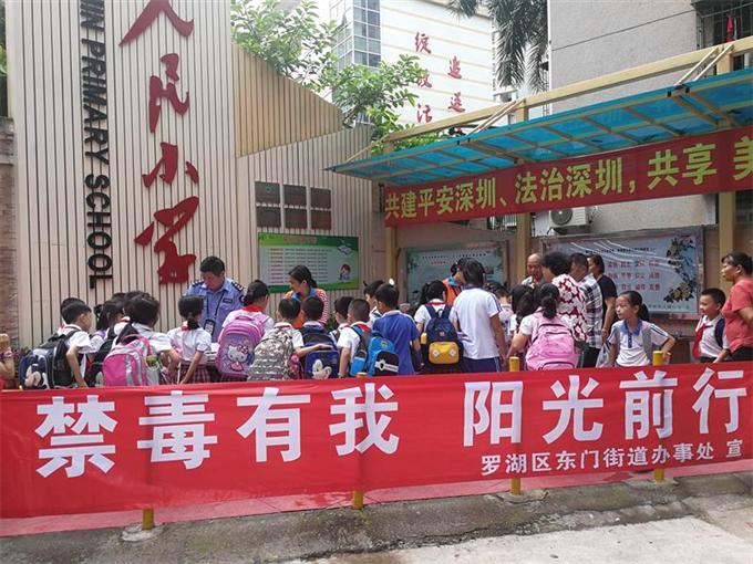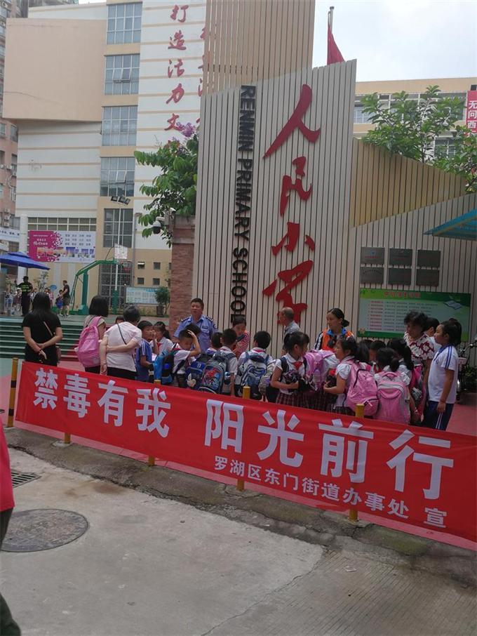 2019年6月17日下午16:00时立新社区联合街道综治办,校园警务室在立新花园人民小学门口开展禁毒宣传活动。