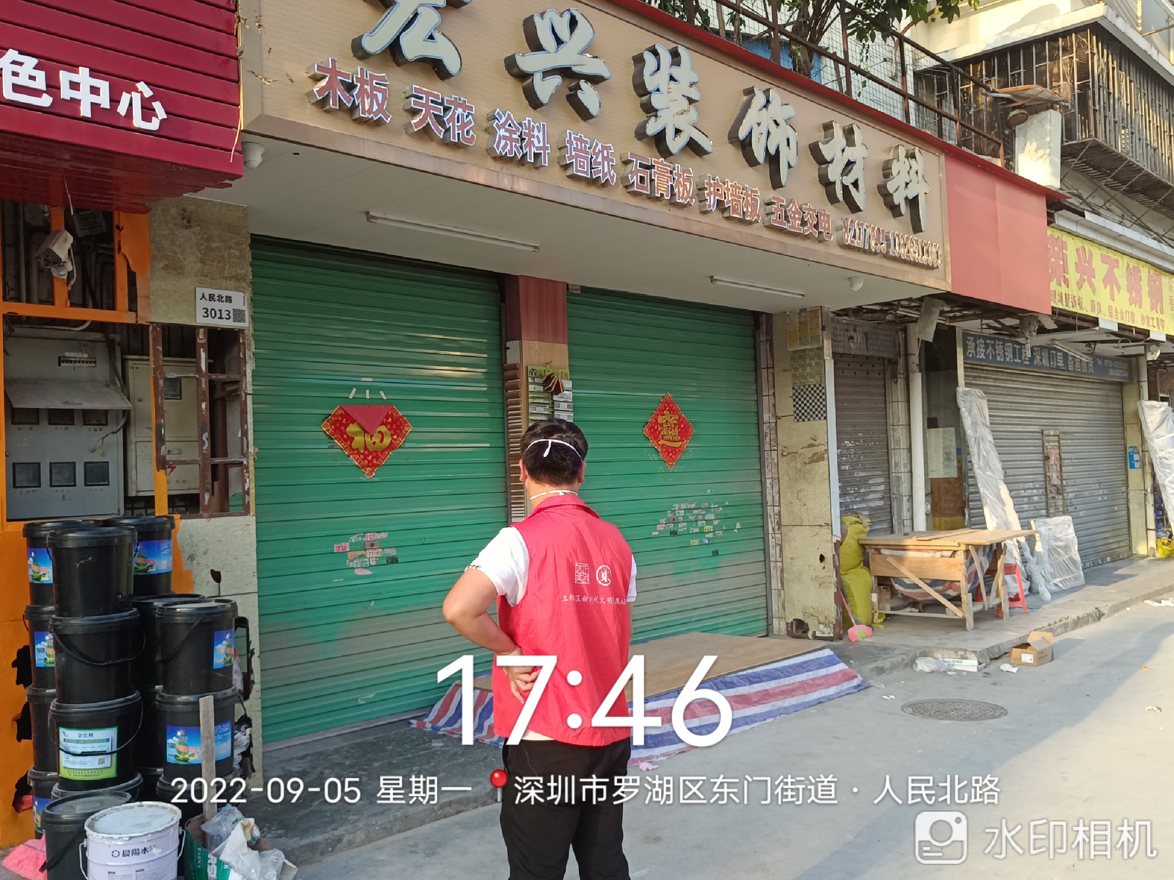 罗湖家园网讯:2022年9月5日,立新社区工作人员巡查新园路路面门店创文情况。