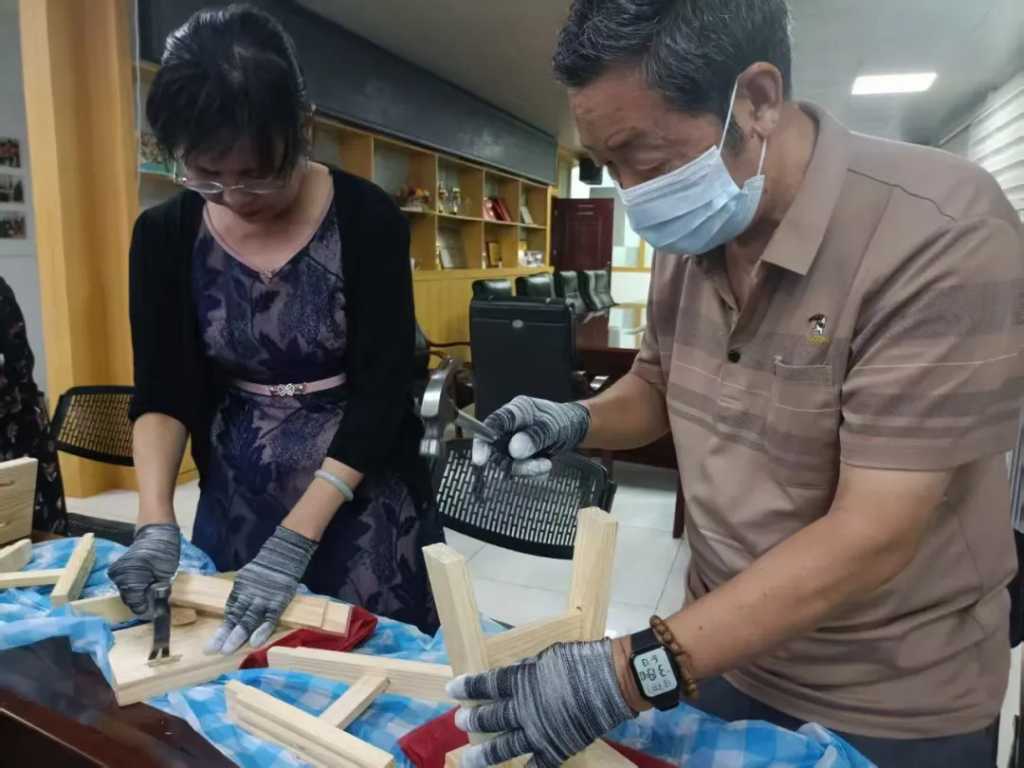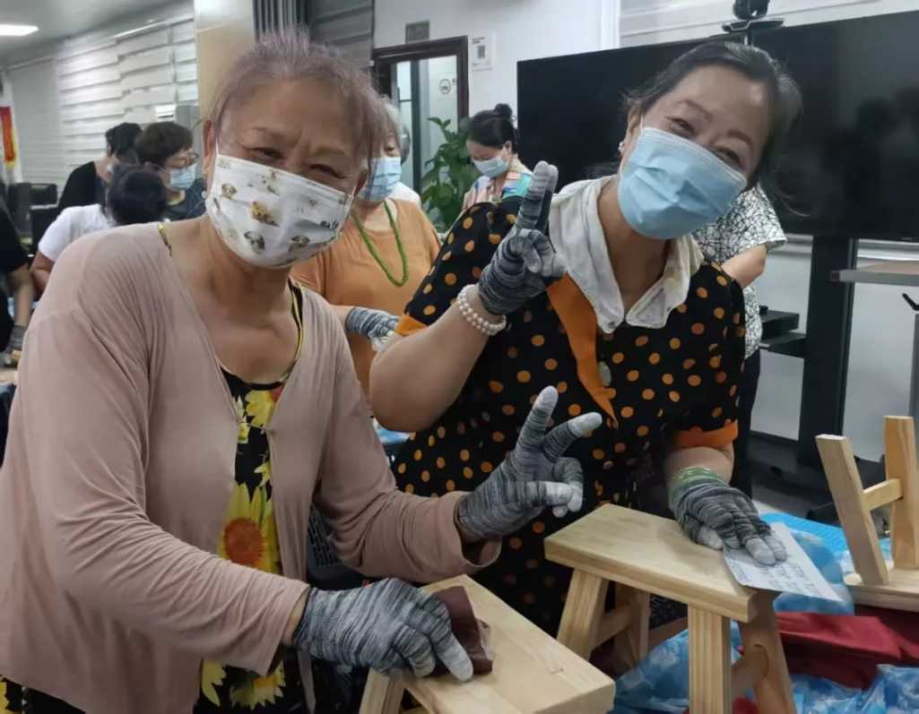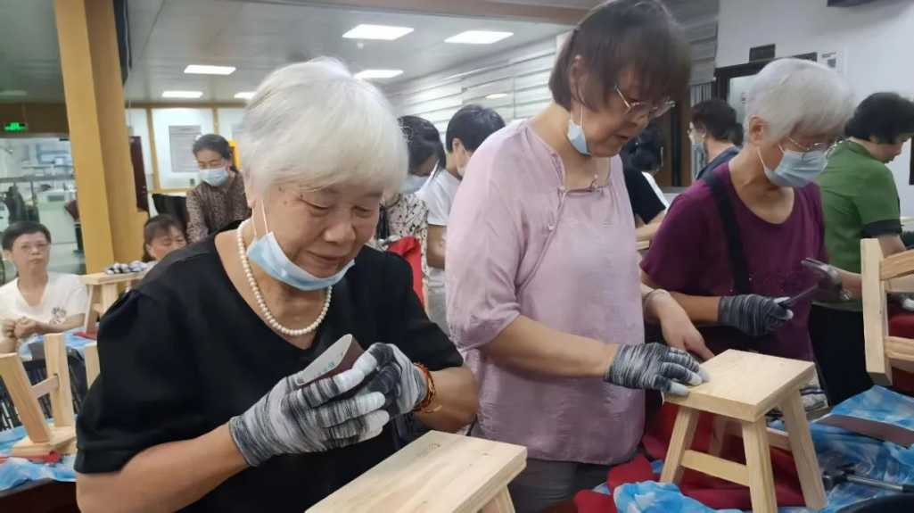 领取包含凳面、凳腿、加固条的材料包后,活动室瞬间响起“哒哒”的敲击声与砂纸打磨木料的沙沙声。