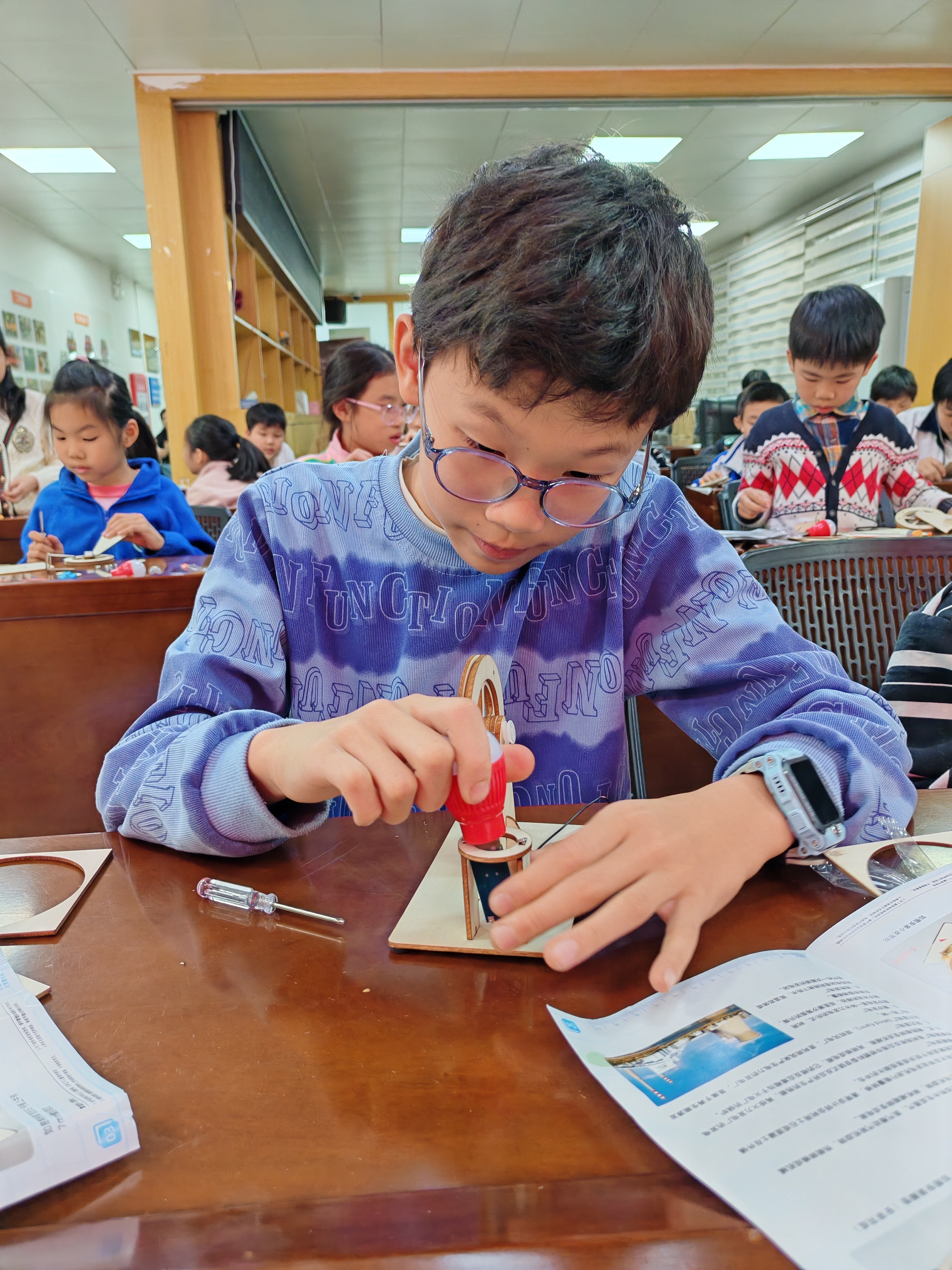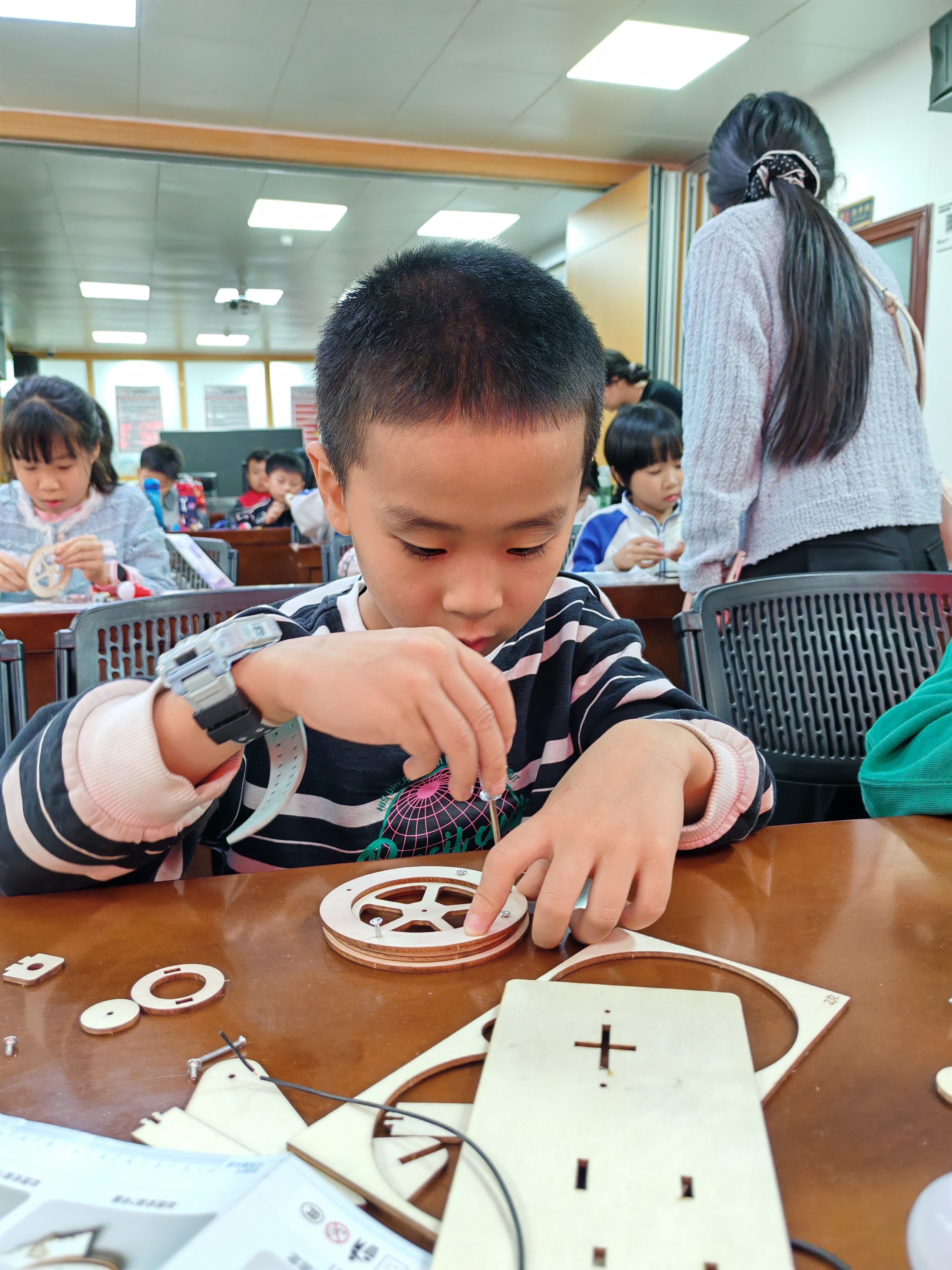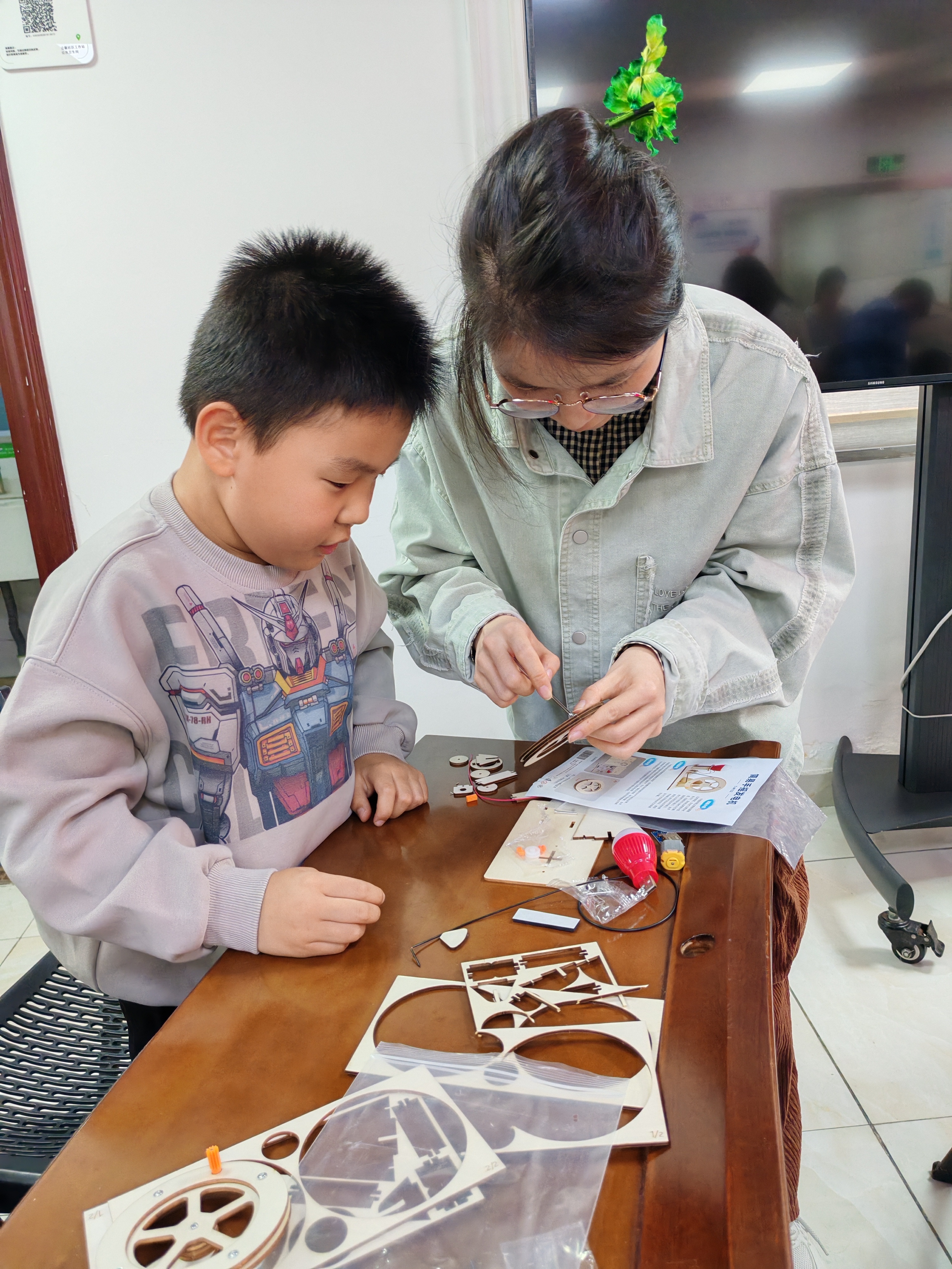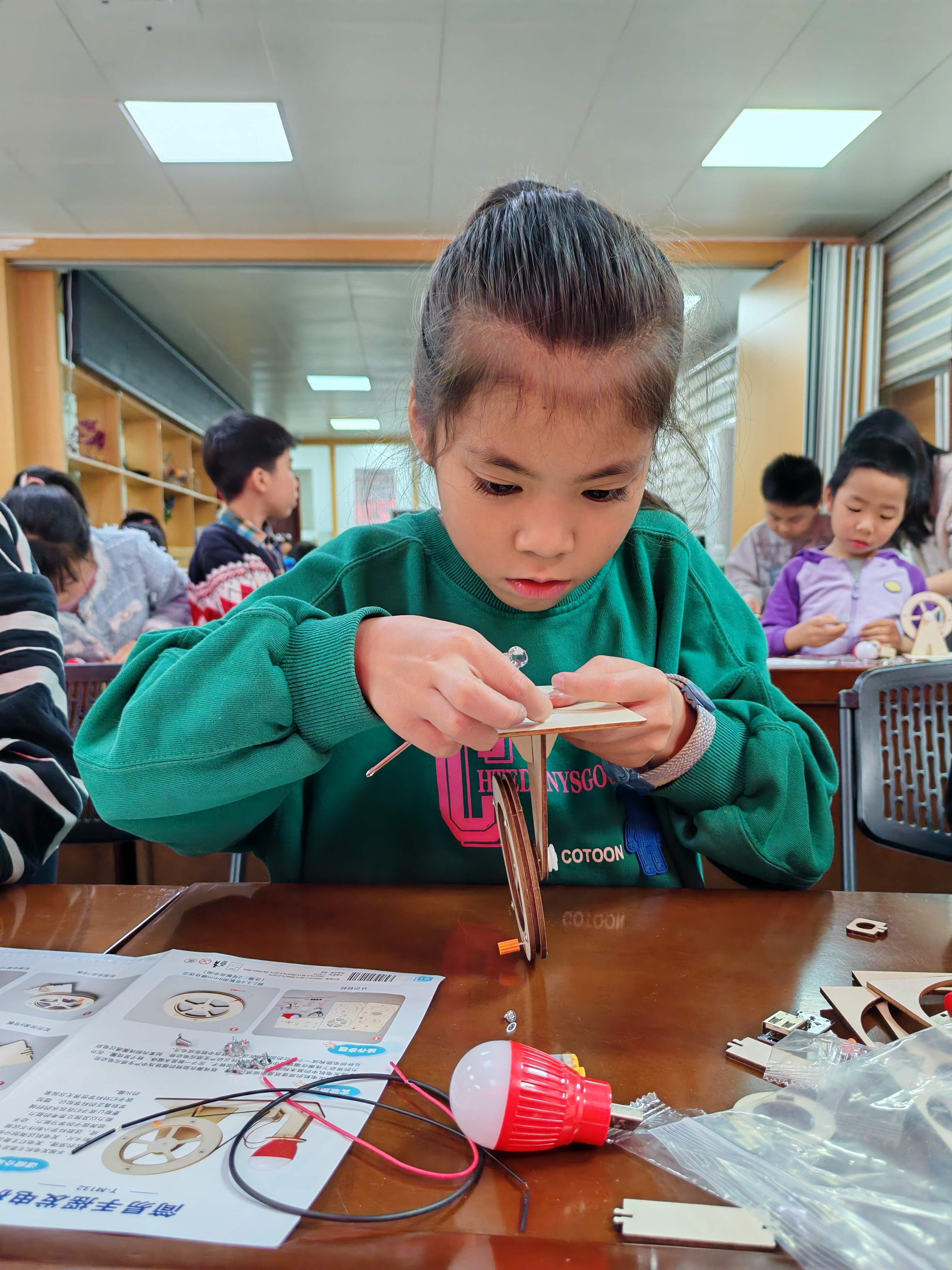 最令人期待的DIY拼装环节,教师分步演示拼装步骤,从搭建木质支架到安装齿轮与发电机组件,再到连接导线和灯泡,每一个关键要点都细致讲解。孩子们专注投入,亲手操作螺丝刀、拼接零件,老师们在旁耐心协助,与孩子们共同攻克拼装过程中遇到的零件松动、导线接线等问题。发电实验环节更是将活动推向高潮。当孩子们转动手摇轮,看到自己亲手拼装的发电机点亮灯泡时,脸上洋溢着满满的成就感与自豪感。成果分享环节,邀请小朋友分享自己的拼装心得与实验发现,教师则结合孩子们的分享,拓展讲解了能量转化在风力发电、水力发电等生活场景中的应用,让孩子们感受到科学与生活的紧密联系。