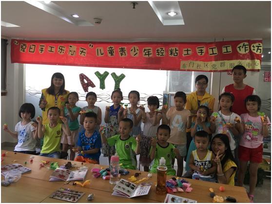 2016年6月25日下午,东门党群服务中心社工开展了“夏日手工乐天Fun”儿童青少年轻粘土手工工作坊.本次活动的目的是通过手工技能的培训,培养个人爱好和技能。