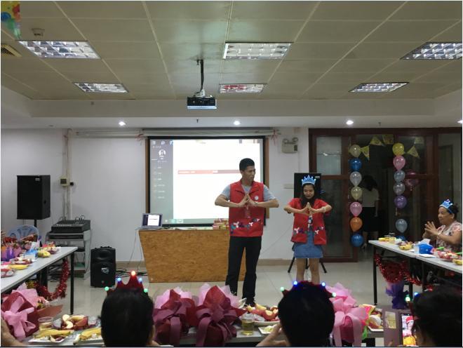 在吃蛋糕之后,是表演环节,长者们跃跃欲试,唱歌又跳舞,展现出自己多才多艺的一面,点燃了会场;接下来由张社工教长者们进行舒筋活络的手指操,最后刘社工为长者们带来精彩的魔术表演,会场气氛达到高潮。