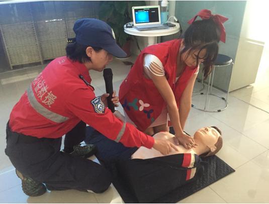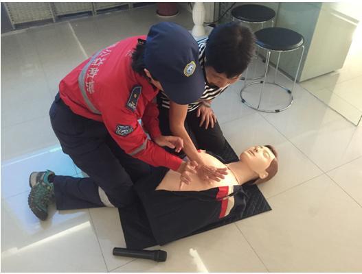 心肺复苏课堂上,在社工讲解完本次活动流程后,由深圳市志愿者联合会专职讲师为居民讲解心肺复苏CPR以及自动体外除颤器的使用。并由讲师实操以及邀请居民参与进行操练。