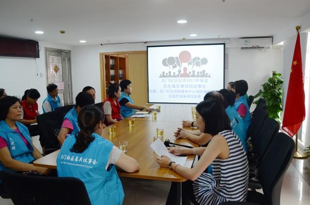 北门居委会于2017年7月19日(星期三)下午3:00在东门社区工作站会议室组织召开社区居民议事会议,对工程类项目《东门社区党群服务中心消防增设检修口及监控设备项目议案》、《东门社区蛟湖路六号大院更换门禁系统项目议案 》进行集中审议。最后议事员们进行举手表决,顺利通过两个项目议案!