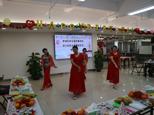 生日会在主持人的祝贺词中开始,本次生日会共分为三个部分:蛋糕分享、节目表演、分发礼物与鲜花及生日贺卡。在生日会现场,由社区工作人员和寿星代表钟阿姨共同切蛋糕,寿星们在品尝着美味的蛋糕和水果的同时,欣赏我们精心准备的节目。首先是由寿星代表叶姨为寿星们表演舞蹈《故乡情》,然后是居民代表潘阿姨表演舞蹈《好人多》,接着是由寿星代表黄叔为寿星们献唱京剧片段,随后是社区太极队代表朱阿姨表演《太极》,还有东门社区老年人协会春雨舞蹈队表演的舞蹈《红枣树》,最后是潘阿姨表演舞蹈《问月》。整个生日会现场充满了欢声笑语、其乐融融。寿星们纷纷表示非常感谢我们为他们举办这次难忘的生日会,希望这个活动一直继续举办下去。