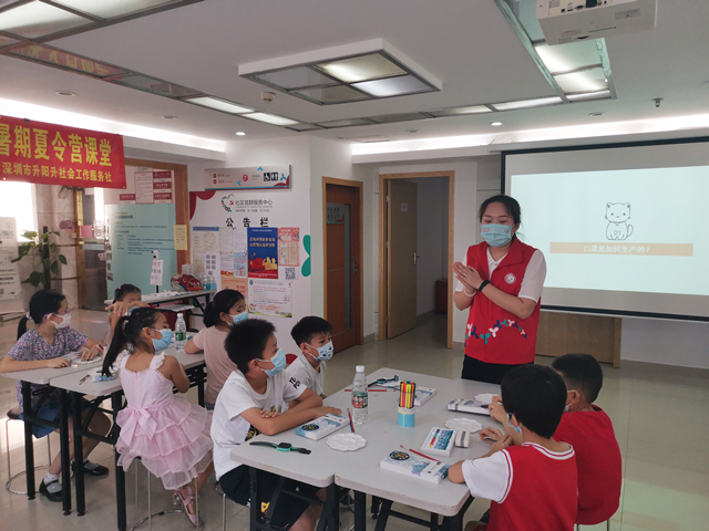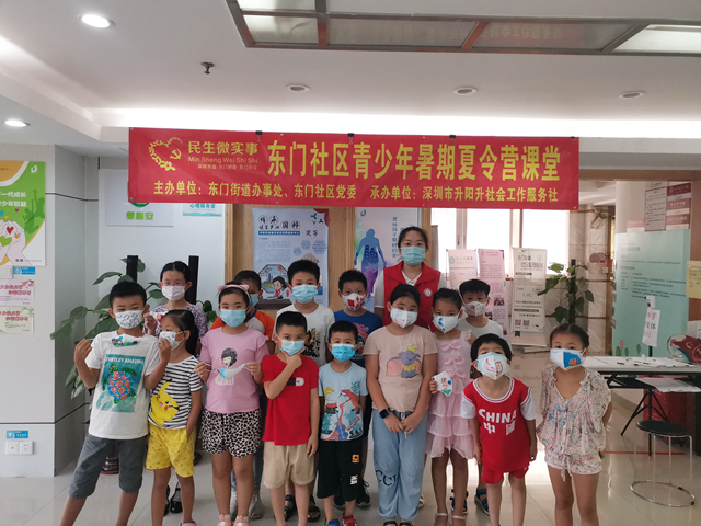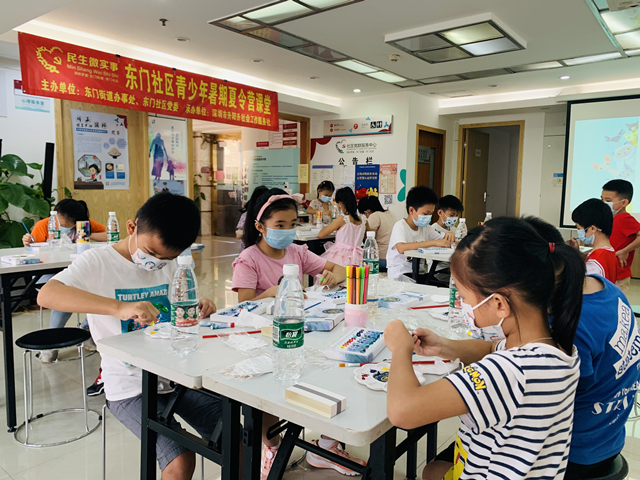 罗湖家园网讯:为进一步普及社区青少年的疫情防控知识,提升他们的独立思考能力,东门社区暑期夏令营课堂--趣味手工课第三节迎来了14名社区青少年,本次手工课的主题为绘制专属口罩。