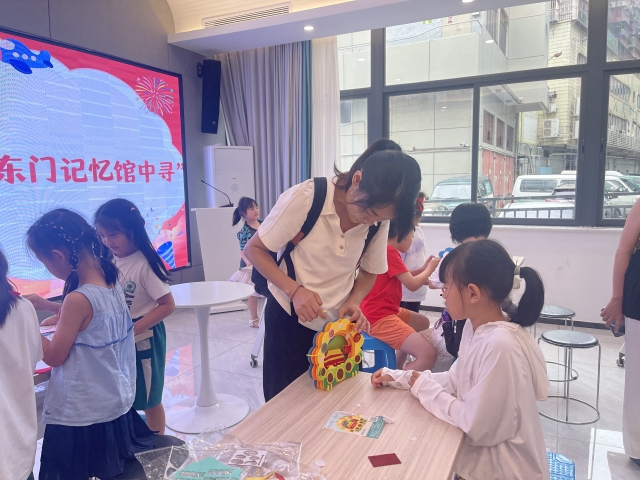 亲子家庭在讲解员的带领下,参观了东门红色记忆馆。大家认真地聆听红色故事,了解先辈们的英勇事迹,从中感受到了红色文化的魅力。随后,手工活动正式开始,在社区工作者的指导下,大家拿起贴画材料,认真仔细地贴出一幅幅有五角星、红旗等充满象征意义的图案,现场其乐融融,弥漫着温馨的氛围。