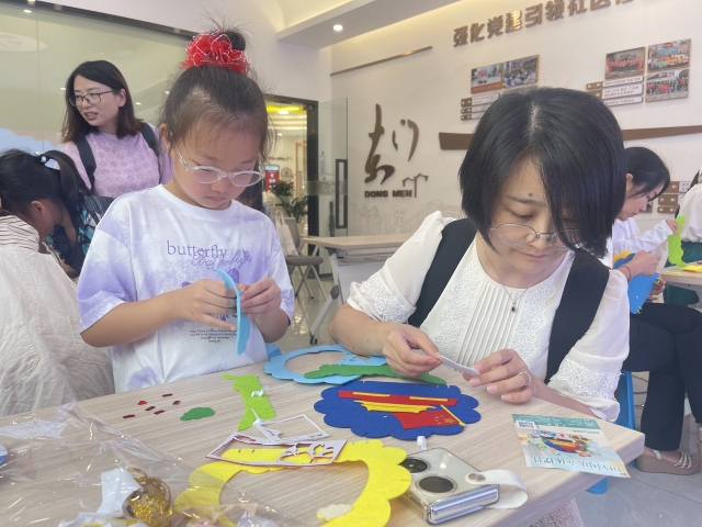 亲子家庭在讲解员的带领下,参观了东门红色记忆馆。大家认真地聆听红色故事,了解先辈们的英勇事迹,从中感受到了红色文化的魅力。随后,手工活动正式开始,在社区工作者的指导下,大家拿起贴画材料,认真仔细地贴出一幅幅有五角星、红旗等充满象征意义的图案,现场其乐融融,弥漫着温馨的氛围。
