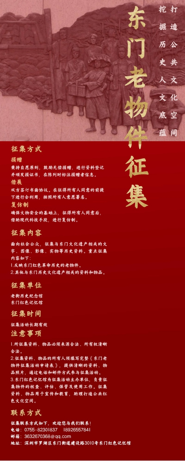罗湖家园网讯:一段岁月,凝聚一份感情;一件旧物,承载一份记忆。睹物忆旧,感受革命老物件历经的风雨沧桑;以小窥大,讲述革命岁月的坎坷与荣光。挖掘东门历史底蕴,共筑人文红色空间!东门社区决定开展“感党恩 跟党走”红色记忆——革命老物件征集和宣传展示活动。