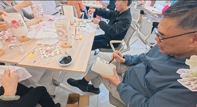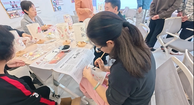 在随后的活动环节中,现场洋溢着浓厚的艺术氛围。书法学员们从琳琅满目的鲜花贴纸中,挑选出自己中意的款式。大家小心地将贴纸从底纸上揭下,精准地贴在台灯灯罩上,组合成各种精美的图案。同时,毛笔书写环节也在火热进行。大家手执毛笔,蘸满浓墨,在台灯灯罩上尽情书写自己喜爱的成语诗词。墨香与贴纸的清新感交融,灯光的映照下,诗词和鲜花贴纸相互映衬,让每一盏台灯都拥有了独一无二的文化韵味。