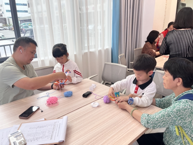 绘本讲解结束后,便是令人期待的彩色小鱼毛线编织手工活动。在社区工作人员的指导下,家长和孩子们共同协作,穿针引线、缠绕毛线。孩子们充分发挥自己的创造力,为小鱼添上五彩斑斓的颜色;家长们则在一旁耐心协助,给予鼓励和帮助。现场气氛温馨融洽,亲子间的互动充满了爱与欢乐。