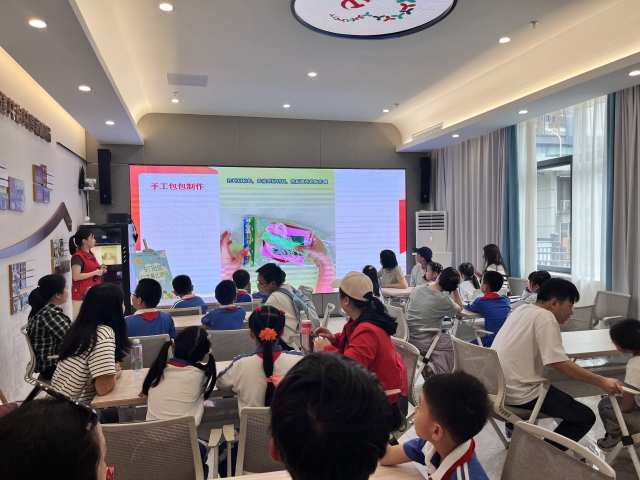 参观完毕,孩子们怀揣着对红色文化的深刻感悟,兴致勃勃地投身于手工挎包 DIY 活动。现场备有琳琅满目的材料,如彩布、针线、装饰配件等,还提供兔子、小猪、草莓等多种萌趣造型模板供孩子们挑选。在社区工作人员的悉心指导下,孩子们充分释放想象力与创造力。有的孩子以鲜艳的红色为主色调,精心在挎包上绣上熠熠生辉的五角星,借此抒发对祖国的炽热热爱;有的则巧妙地将革命故事中的经典元素绘制于挎包表面。孩子们专心致志,穿针引线、粘贴装饰,忙得热火朝天。