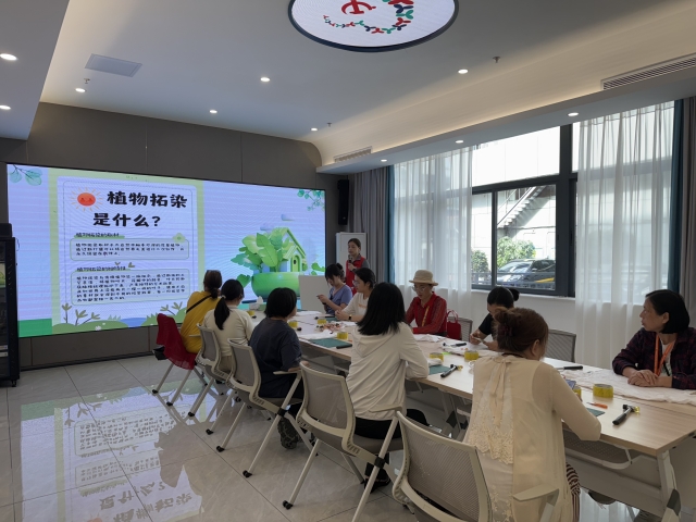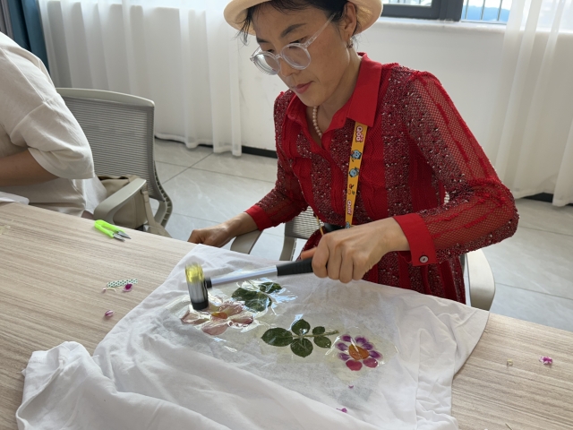 制作环节里,各场活动亮点纷呈。首场以妇女为主的活动中,大家精心搭配植物,交流着色彩搭配与构图技巧,将素雅的叶片、娇艳的花朵拓印在T恤上,赋予白T恤独特的艺术气息,让非遗艺术融入生活。第二场儿童专场,社区工作人员先讲述《这片草地真美丽》绘本,孩子们被人与自然和谐的画面吸引,对破坏环境情节深感惋惜。绘本讲完,孩子们带着对自然的爱护之心,认真挑选植物,用小手创作出童趣满满的图案,拓印完成后兴奋展示作品。最后一场面向老人的活动,老人们一边回忆往昔岁月,一边专注地敲打植物,将对自然的热爱与岁月沉淀的审美融入其中,制作出充满岁月韵味的作品。