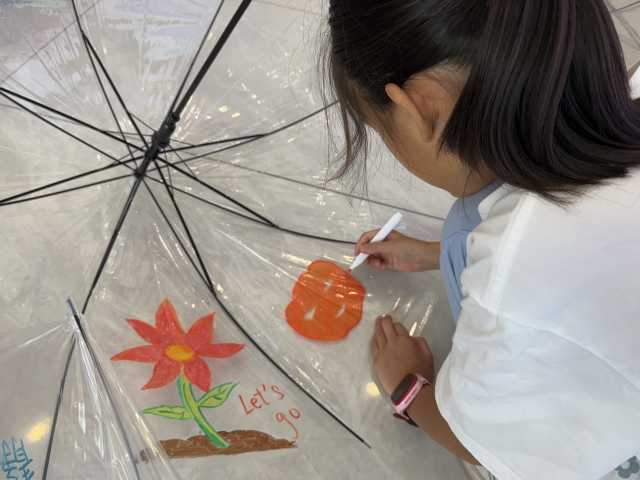 活动开始,工作人员通过趣味提问的方式与孩子们互动,小朋友们踊跃举手,争相回答,现场气氛热烈。随后进入亲子共绘雨伞环节。家长和孩子们发挥想象力,用五彩斑斓的颜料描绘出花朵、彩虹、小动物等充满童趣的图案。有的孩子在伞面上画上蝴蝶结,有的孩子给小恐龙上色,一把把普通的雨伞瞬间变成了独一无二的艺术品,生动诠释了 “不惧怕风雨,即使在风雨中依然保持快乐与希望”的活动主题。