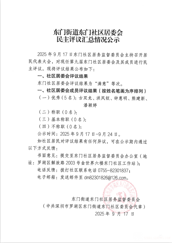 【公示】东门街道东门社区居委会民主评议汇总情况公示