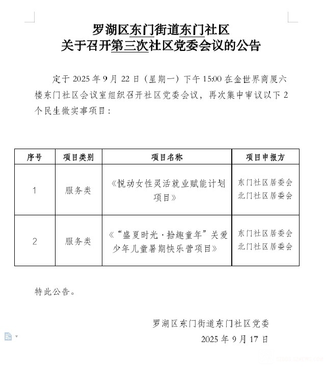 【公告】罗湖区东门街道东门社区关于召开第三次社区党委会议公告