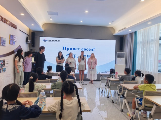 活动现场,来自俄罗斯的留学生带来了干货满满的俄语小课堂。从基础的“Привет(你好)”“Спасибо(谢谢)”“Пока(再见)”,到日常问候 “Кактебязовут? Менязовут……(你叫什么名字?我的名字是……)”,为加深理解,留学生还特意设计情景模拟环节,邀请孩子们上台用刚学会的俄语进行对话交流,在轻松互动中帮助大家巩固知识点,提升语言运用能力。