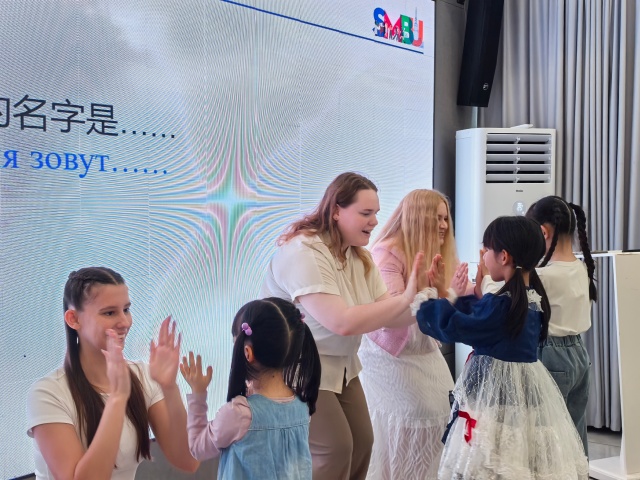 活动现场,来自俄罗斯的留学生带来了干货满满的俄语小课堂。从基础的“Привет(你好)”“Спасибо(谢谢)”“Пока(再见)”,到日常问候 “Кактебязовут? Менязовут……(你叫什么名字?我的名字是……)”,为加深理解,留学生还特意设计情景模拟环节,邀请孩子们上台用刚学会的俄语进行对话交流,在轻松互动中帮助大家巩固知识点,提升语言运用能力。